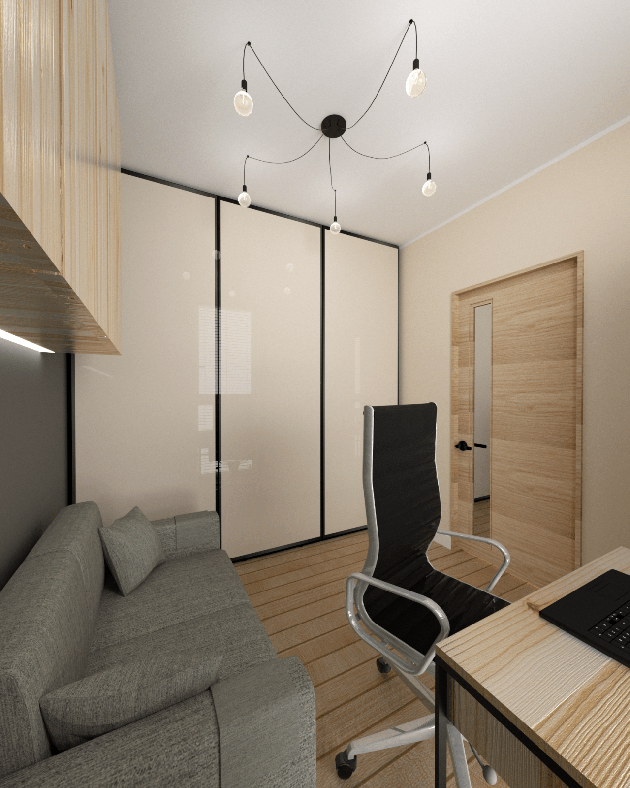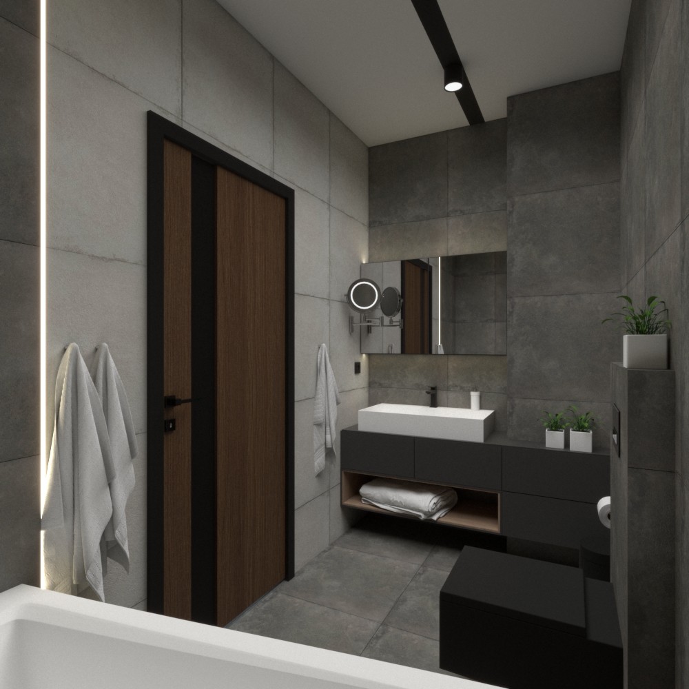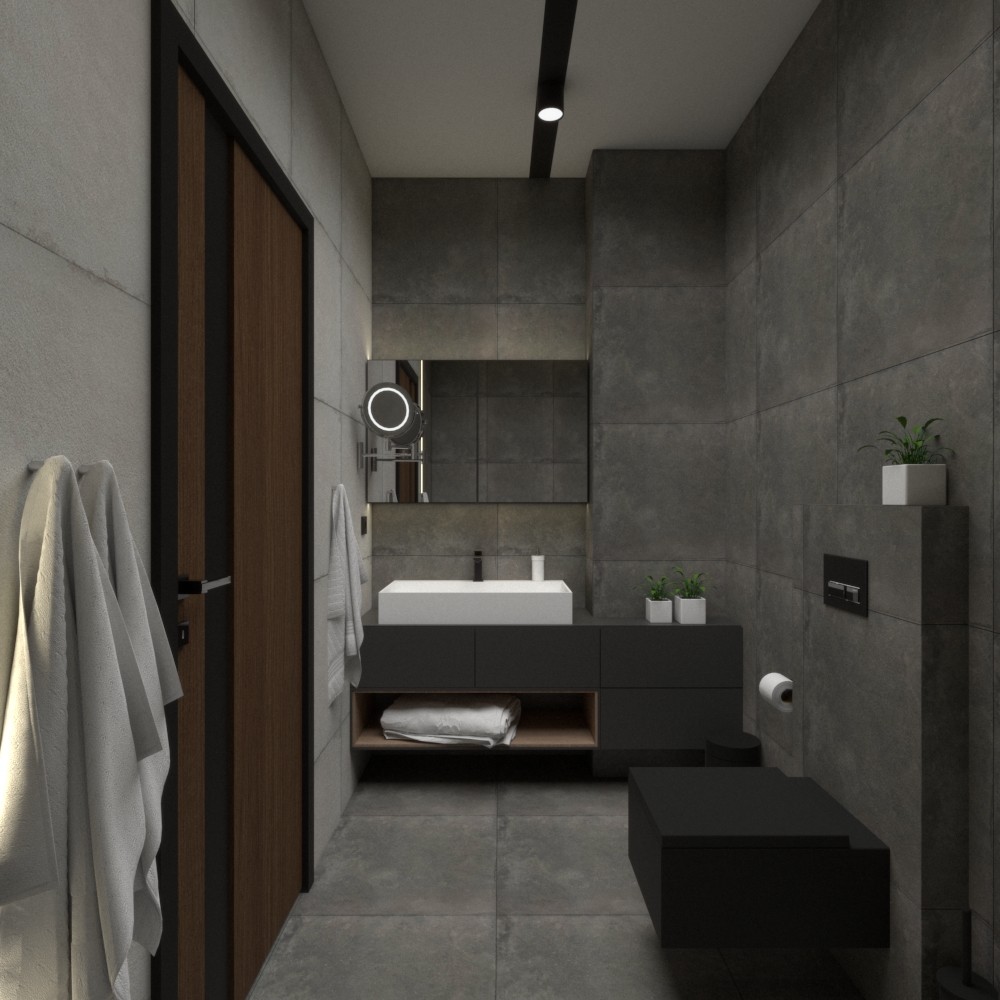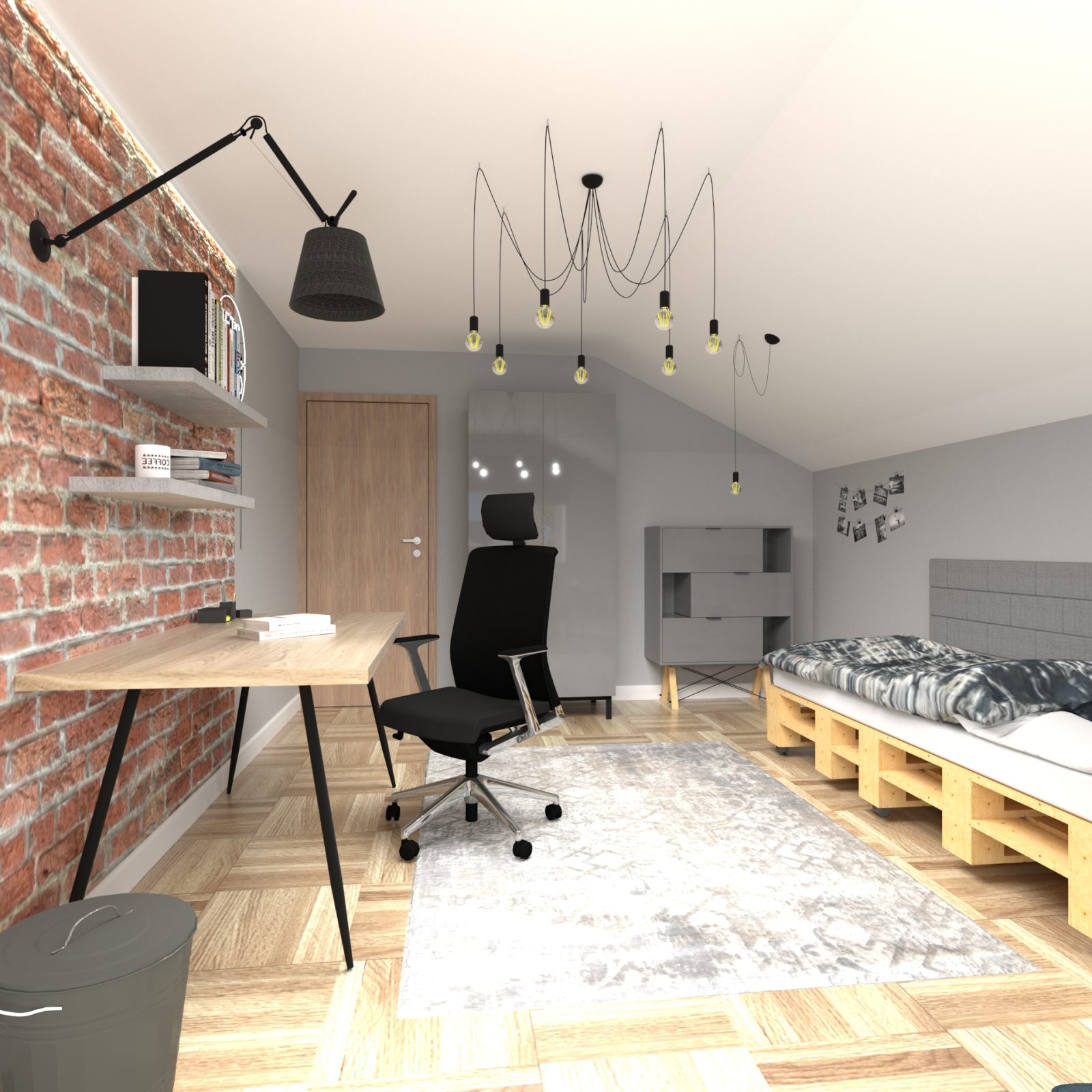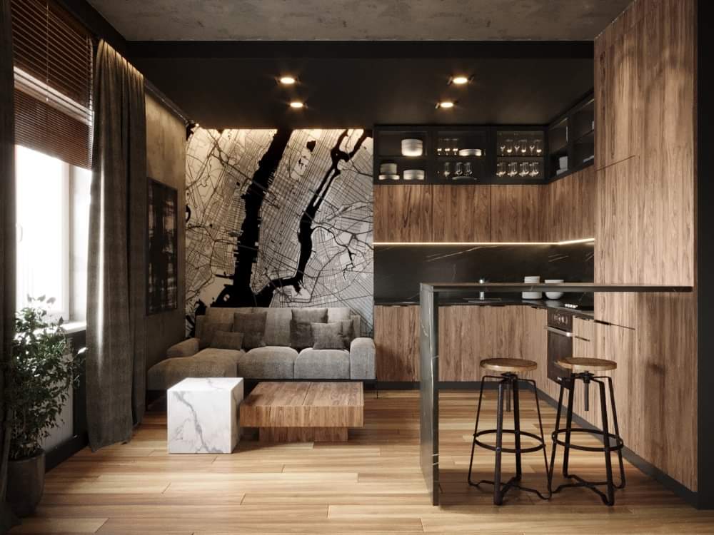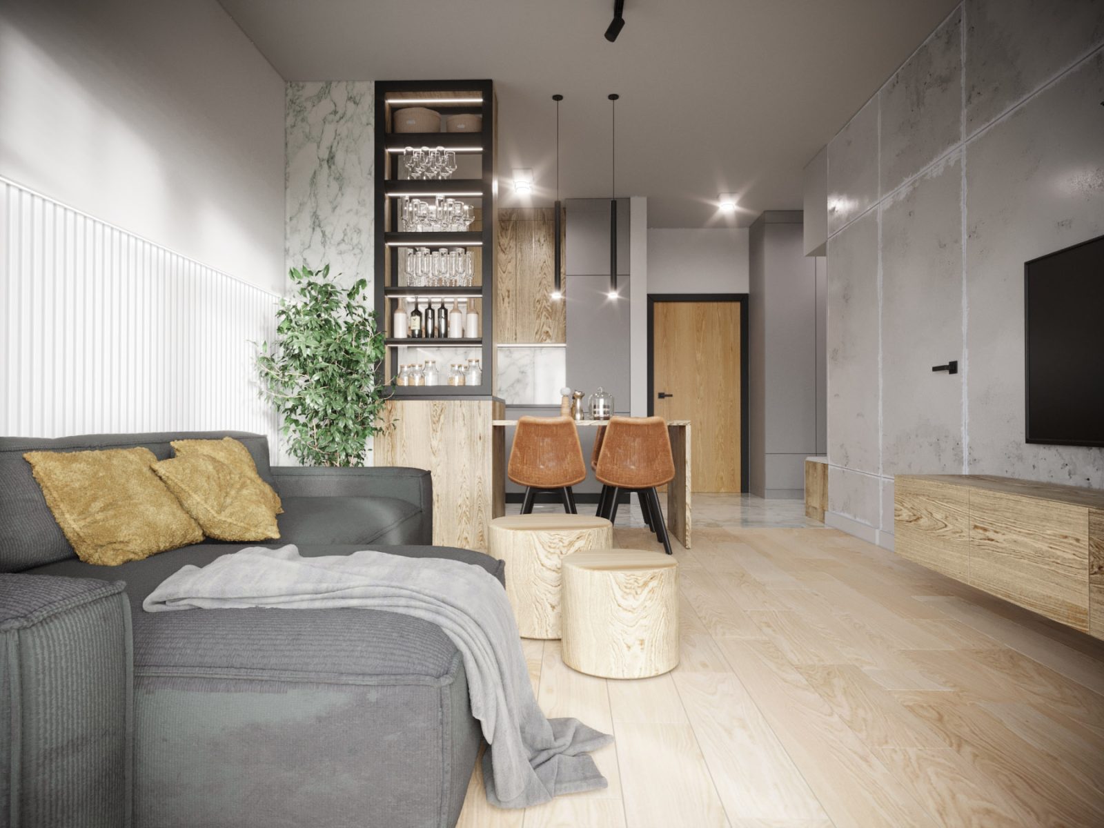 Mieszkanie dla studenta w odcieniach antracytu, beżu i drewna. Nowoczesne ale przytulne, miękkie i plastyczne materiały, zbalansowana kolorystyka. Niebawem – realistyczna sesja.