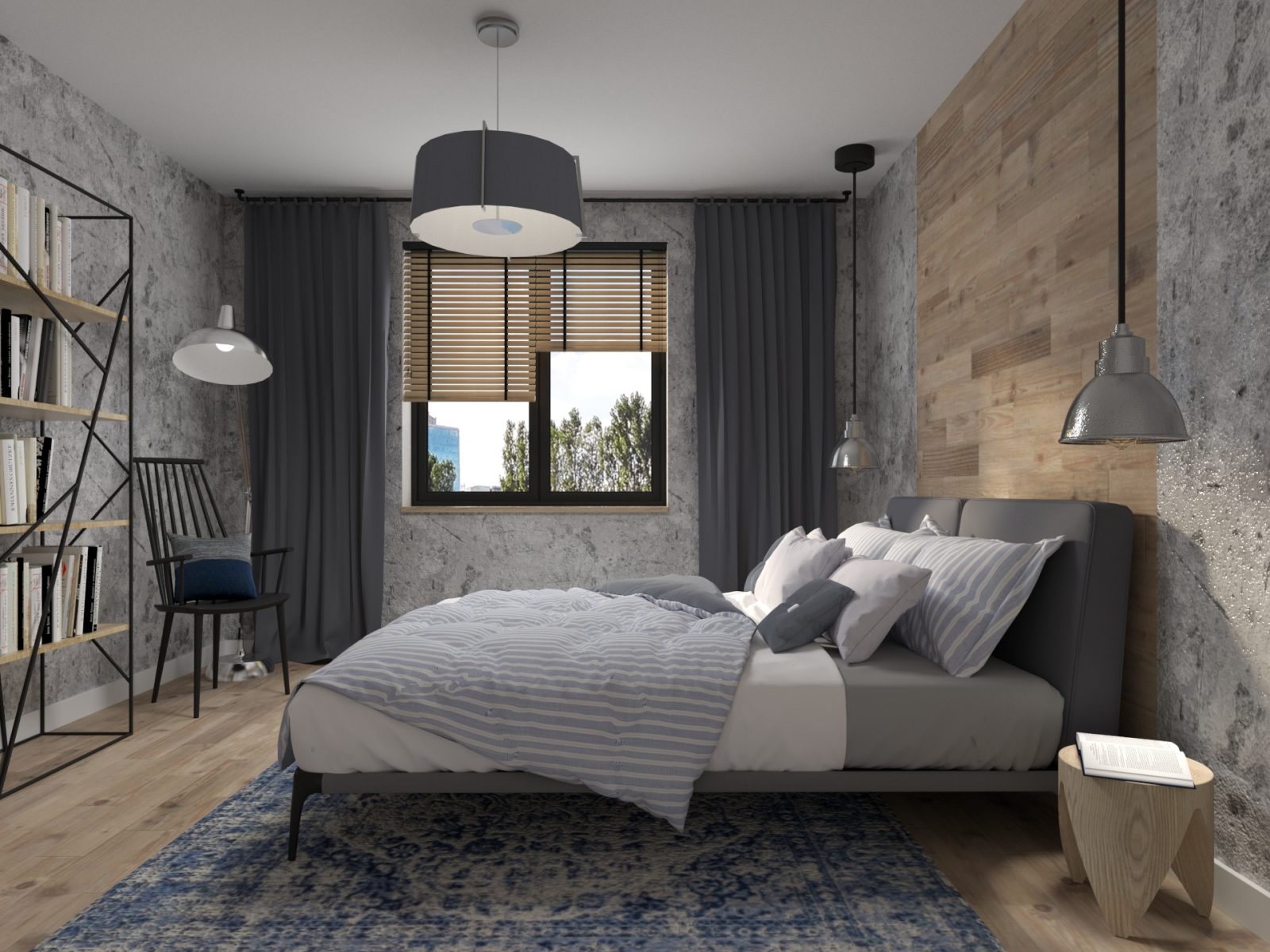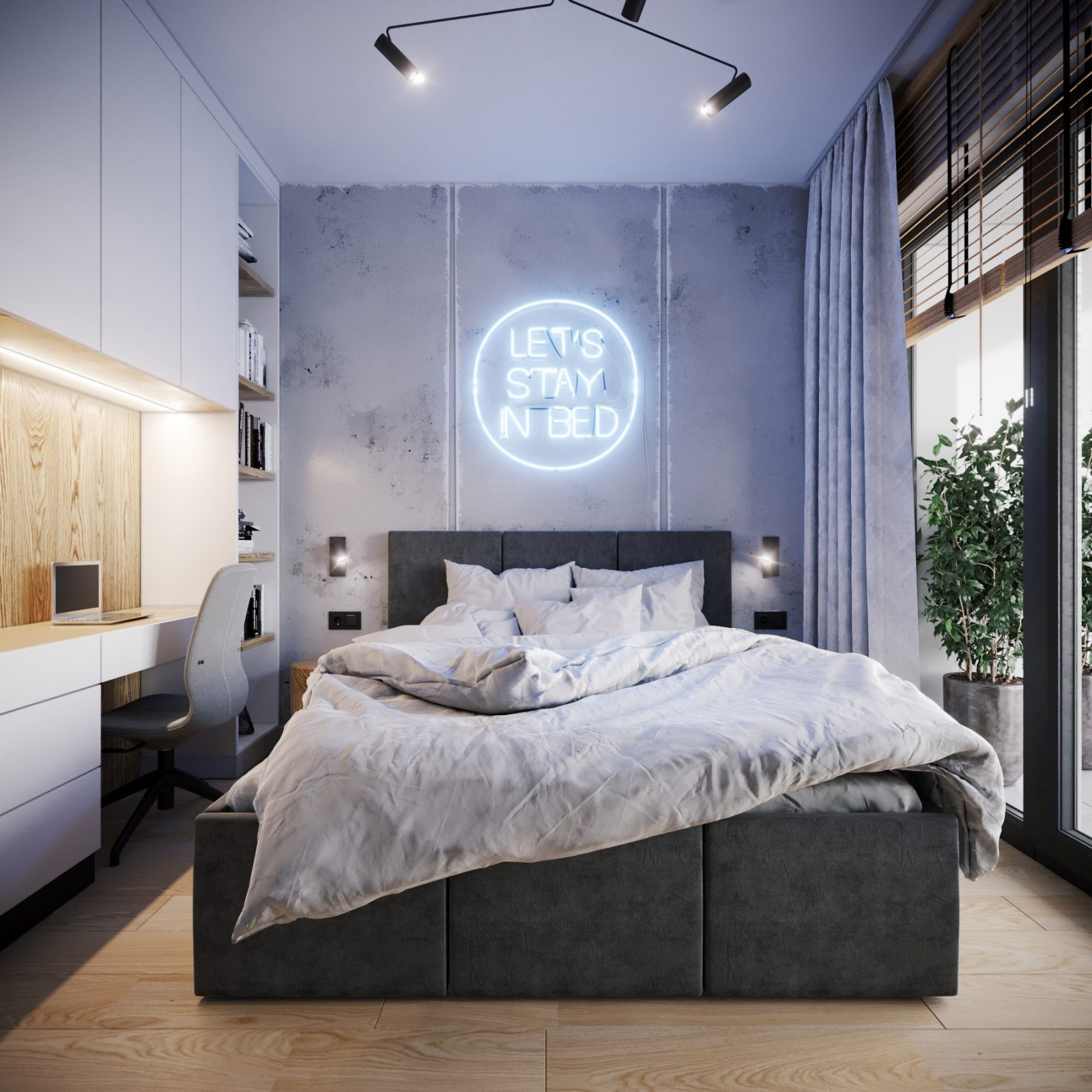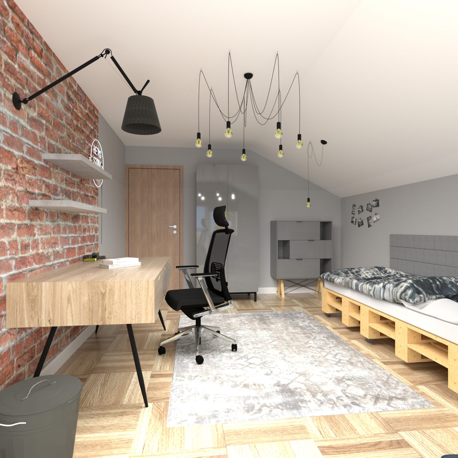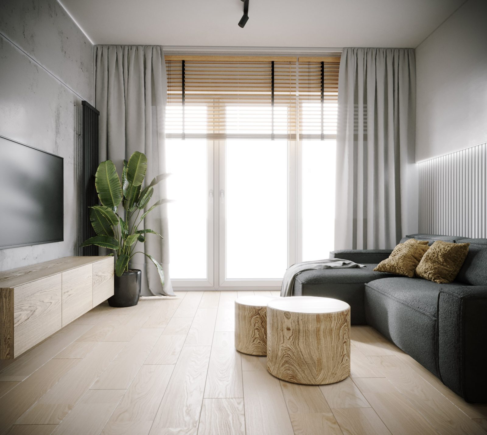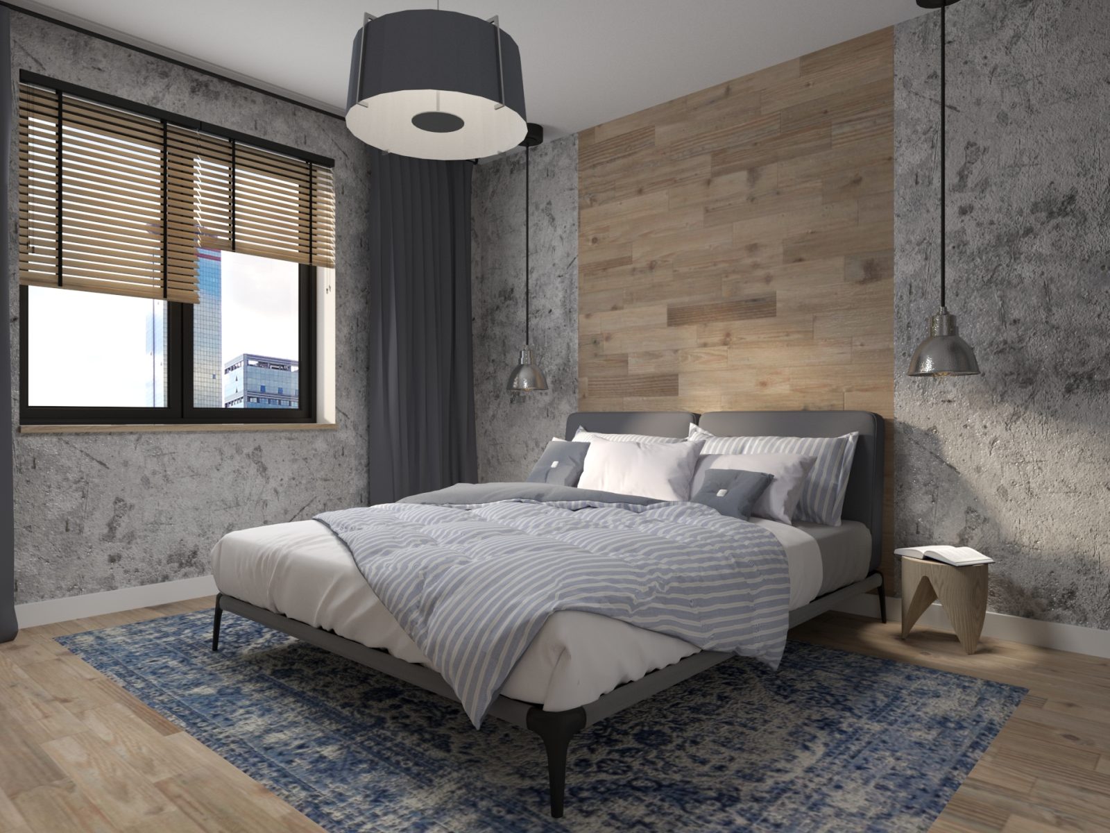 Mieszkanie dla studenta w odcieniach antracytu, beżu i drewna. Nowoczesne ale przytulne, miękkie i plastyczne materiały, zbalansowana kolorystyka. Niebawem – realistyczna sesja.