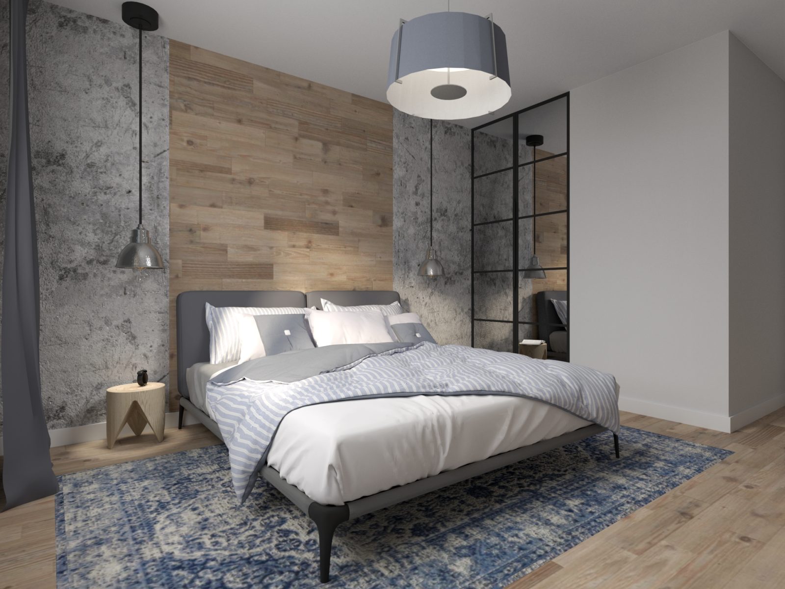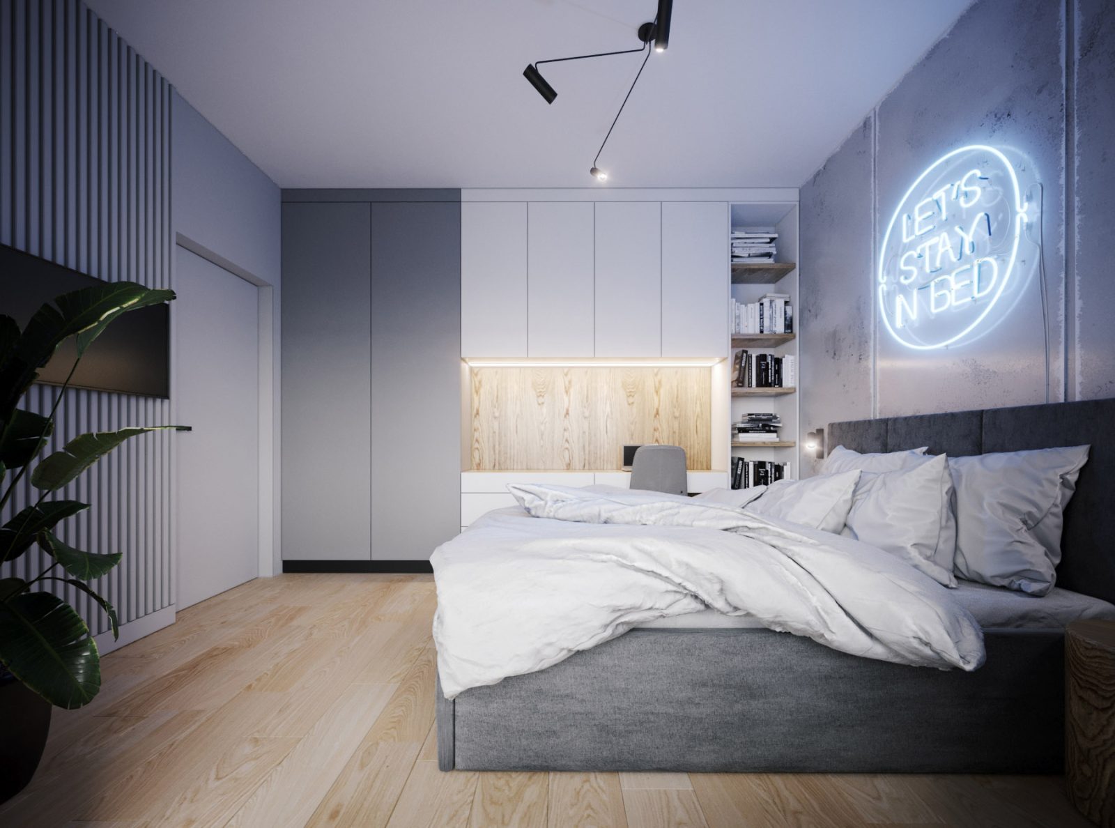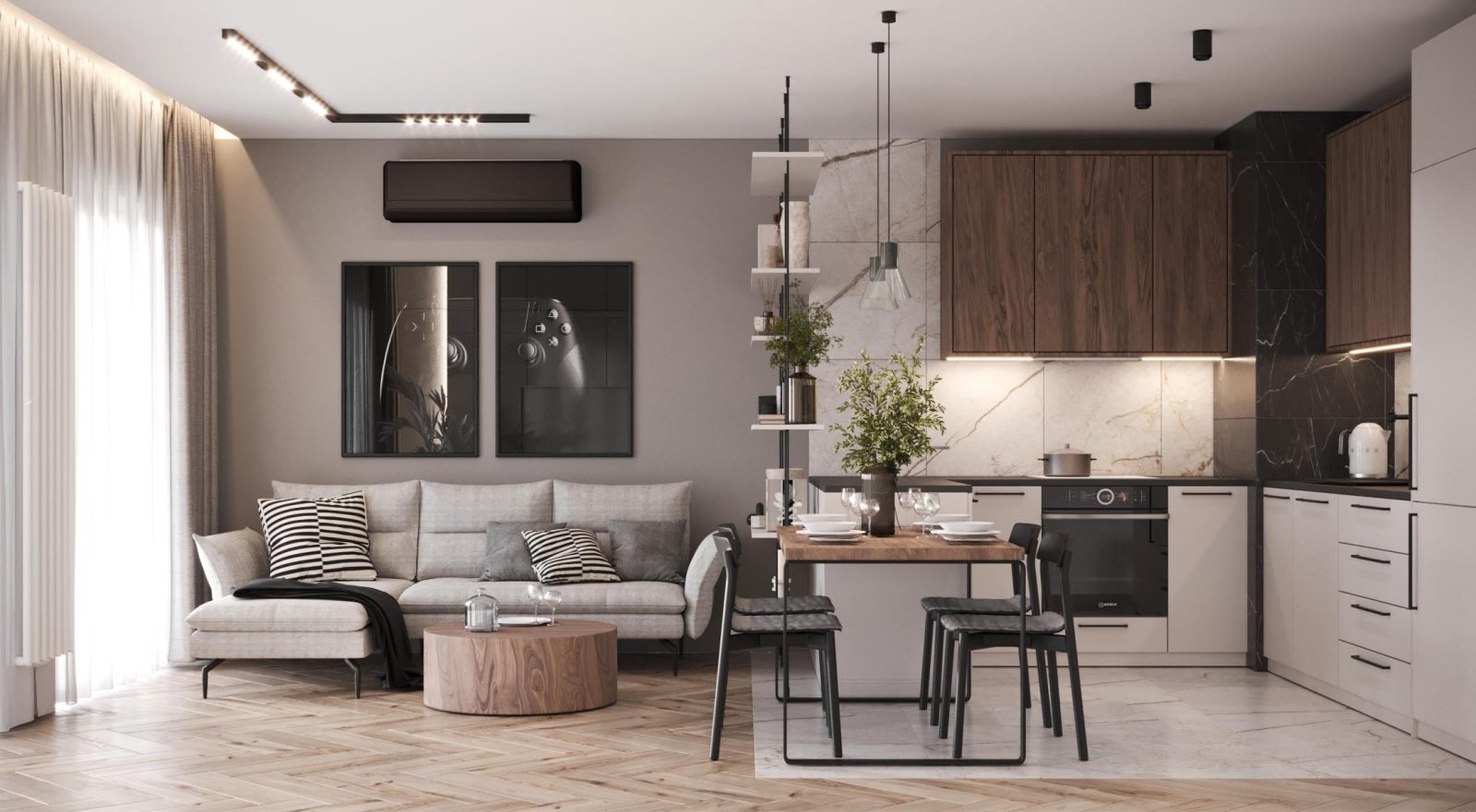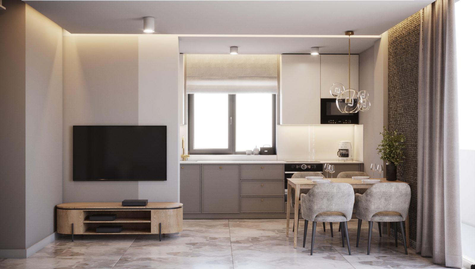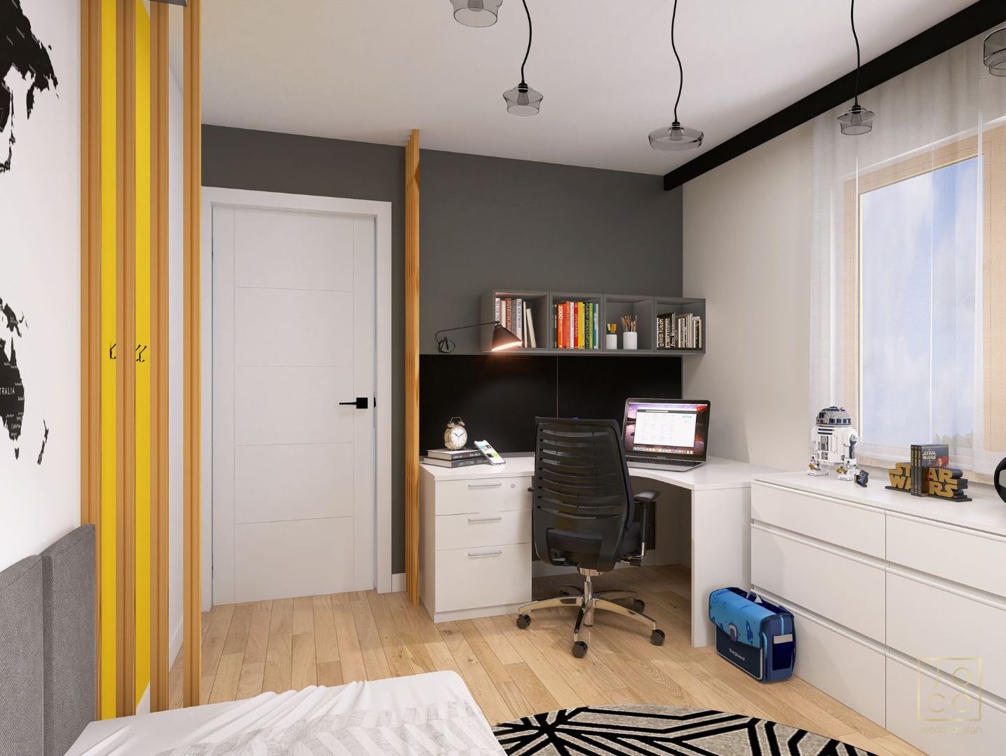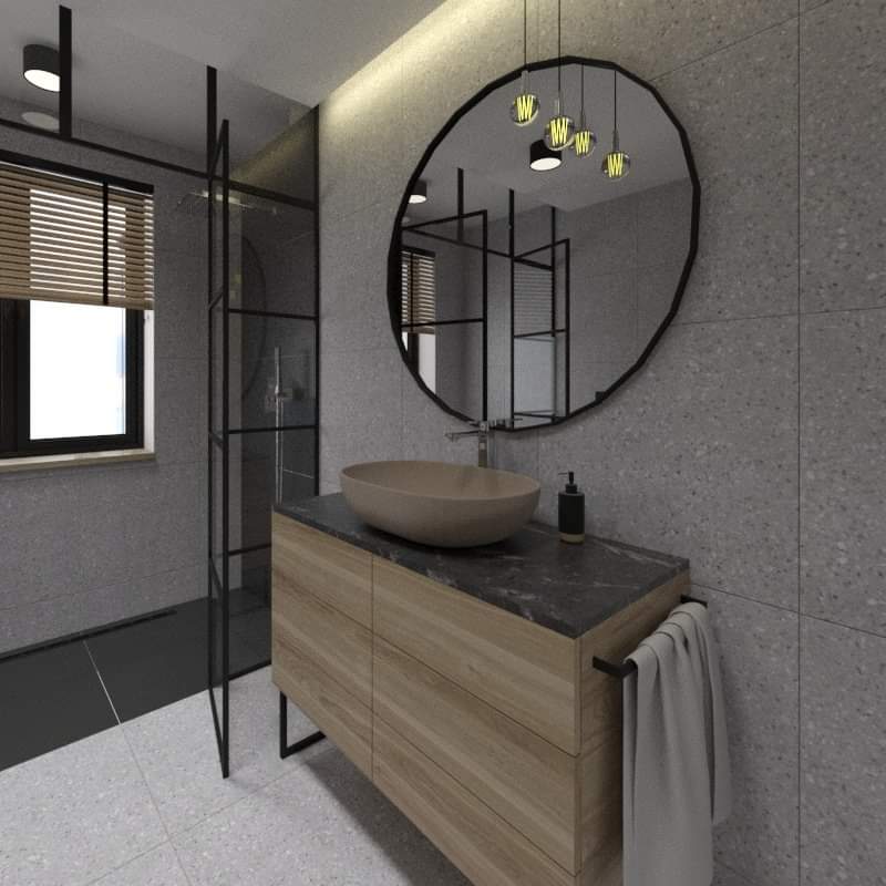 Mieszkanie dla studenta w odcieniach antracytu, beżu i drewna. Nowoczesne ale przytulne, miękkie i plastyczne materiały, zbalansowana kolorystyka. Niebawem – realistyczna sesja.