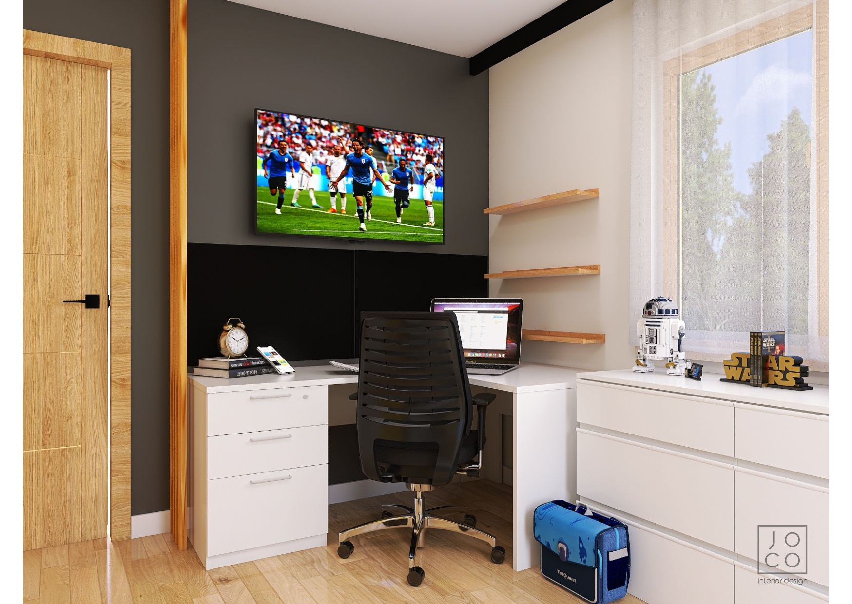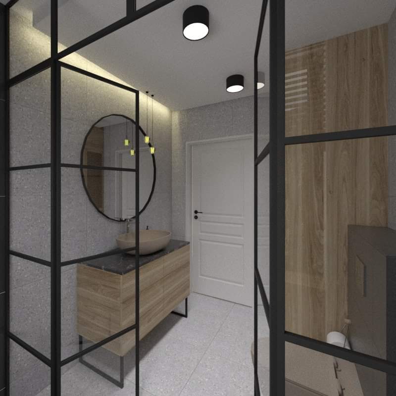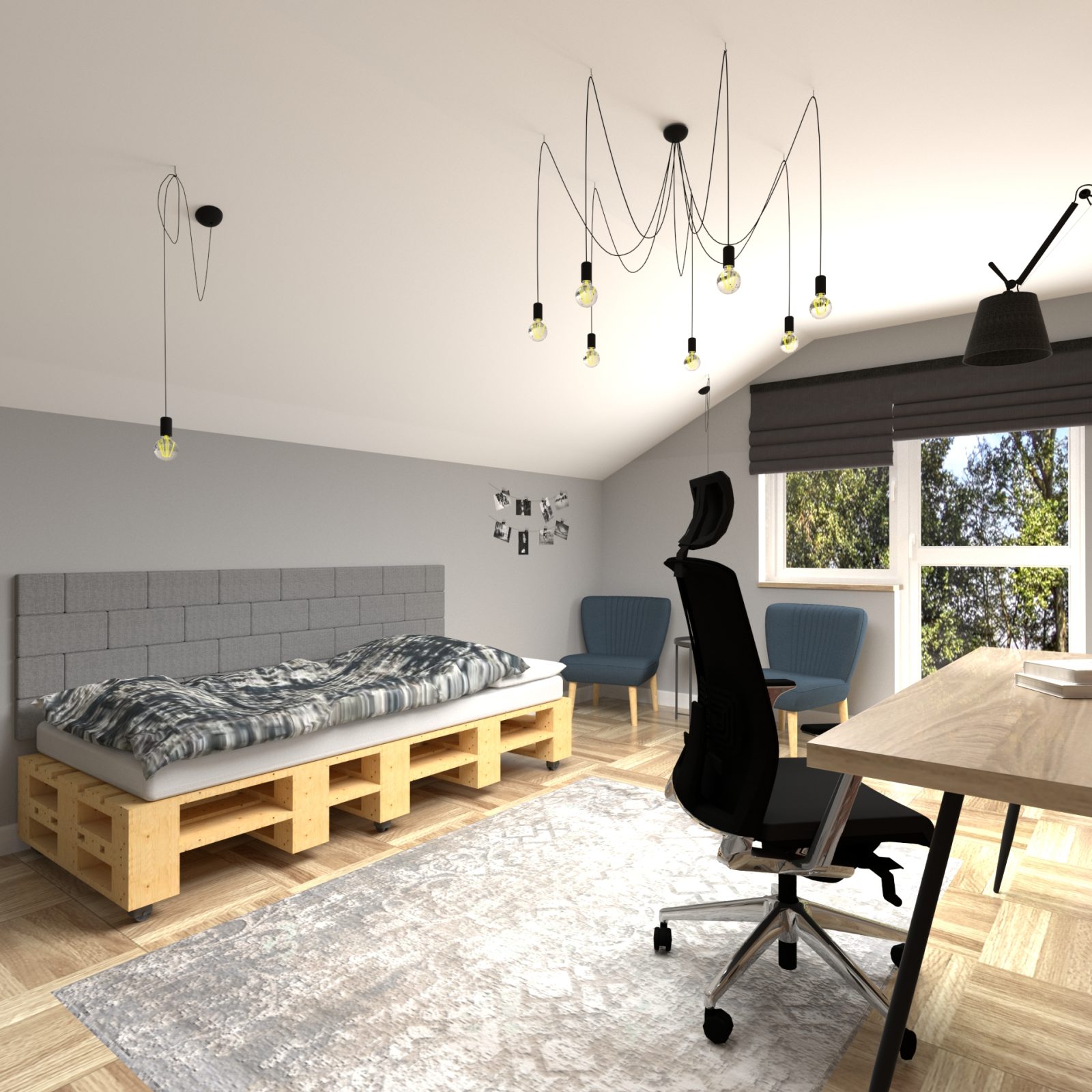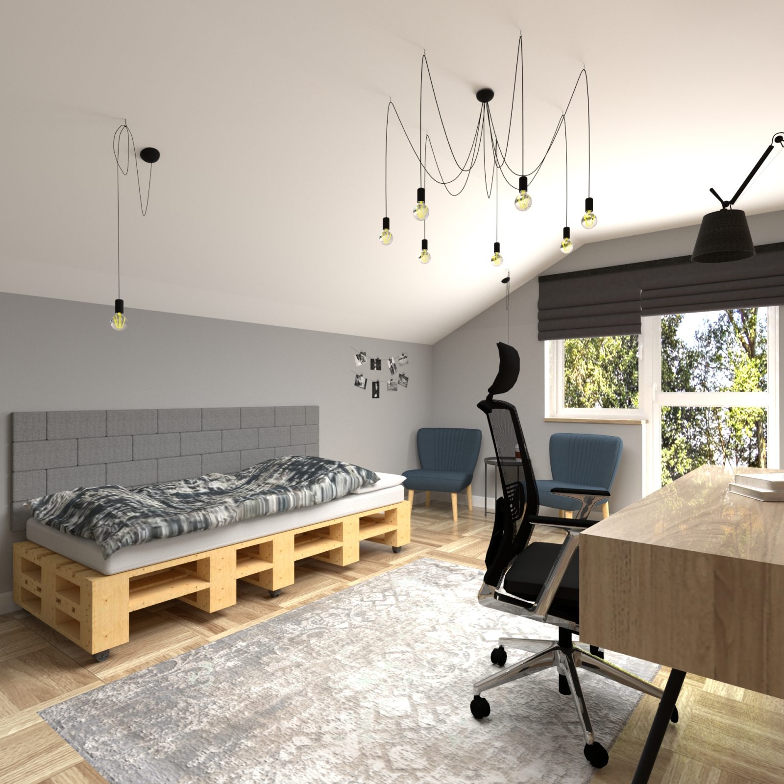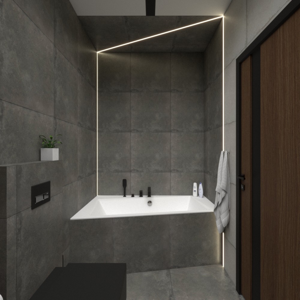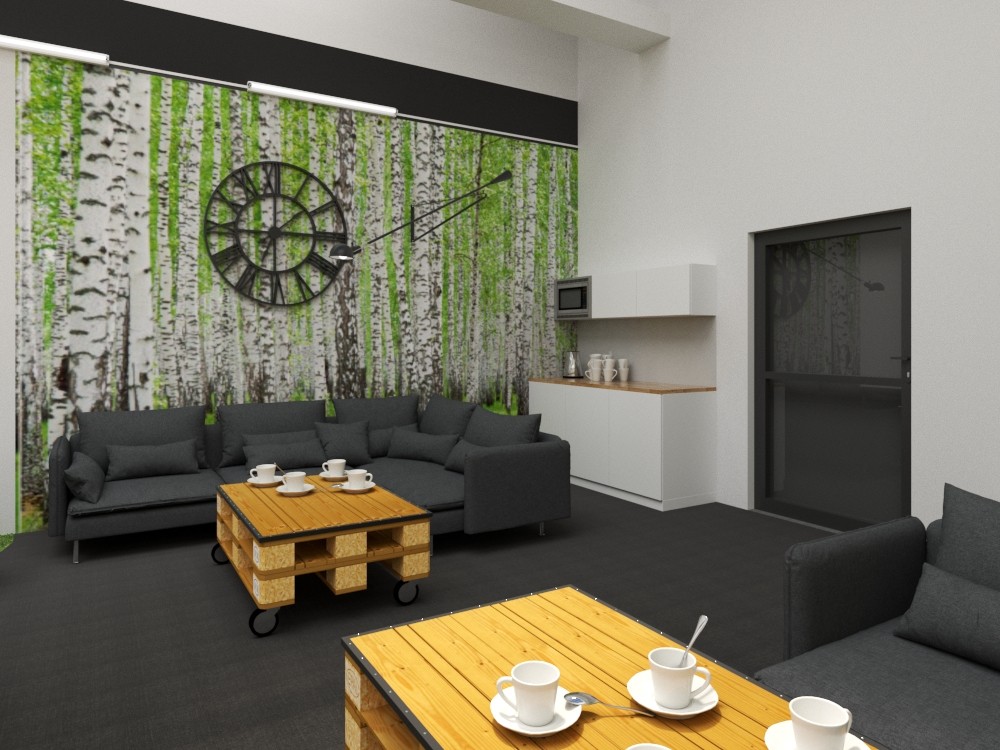 Mieszkanie dla studenta w odcieniach antracytu, beżu i drewna. Nowoczesne ale przytulne, miękkie i plastyczne materiały, zbalansowana kolorystyka. Niebawem – realistyczna sesja.