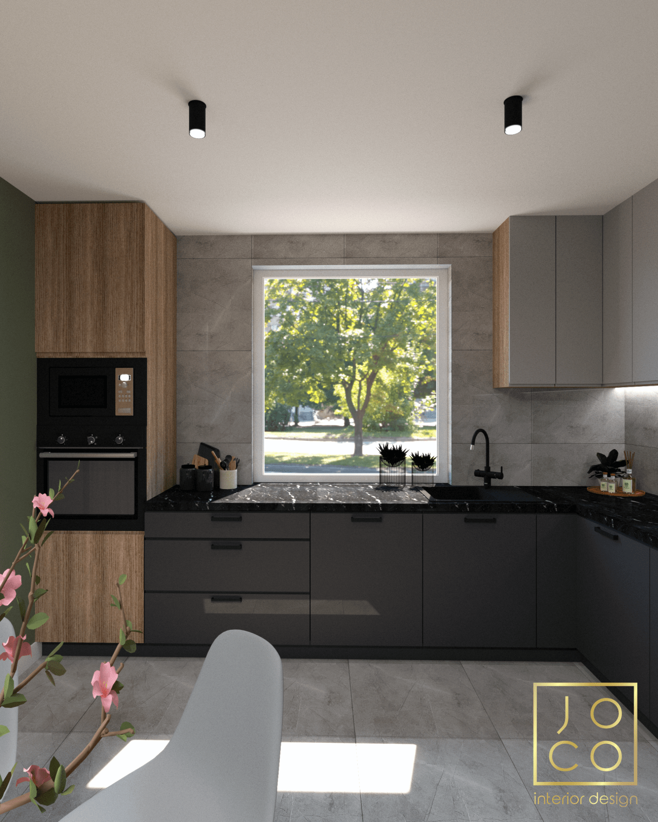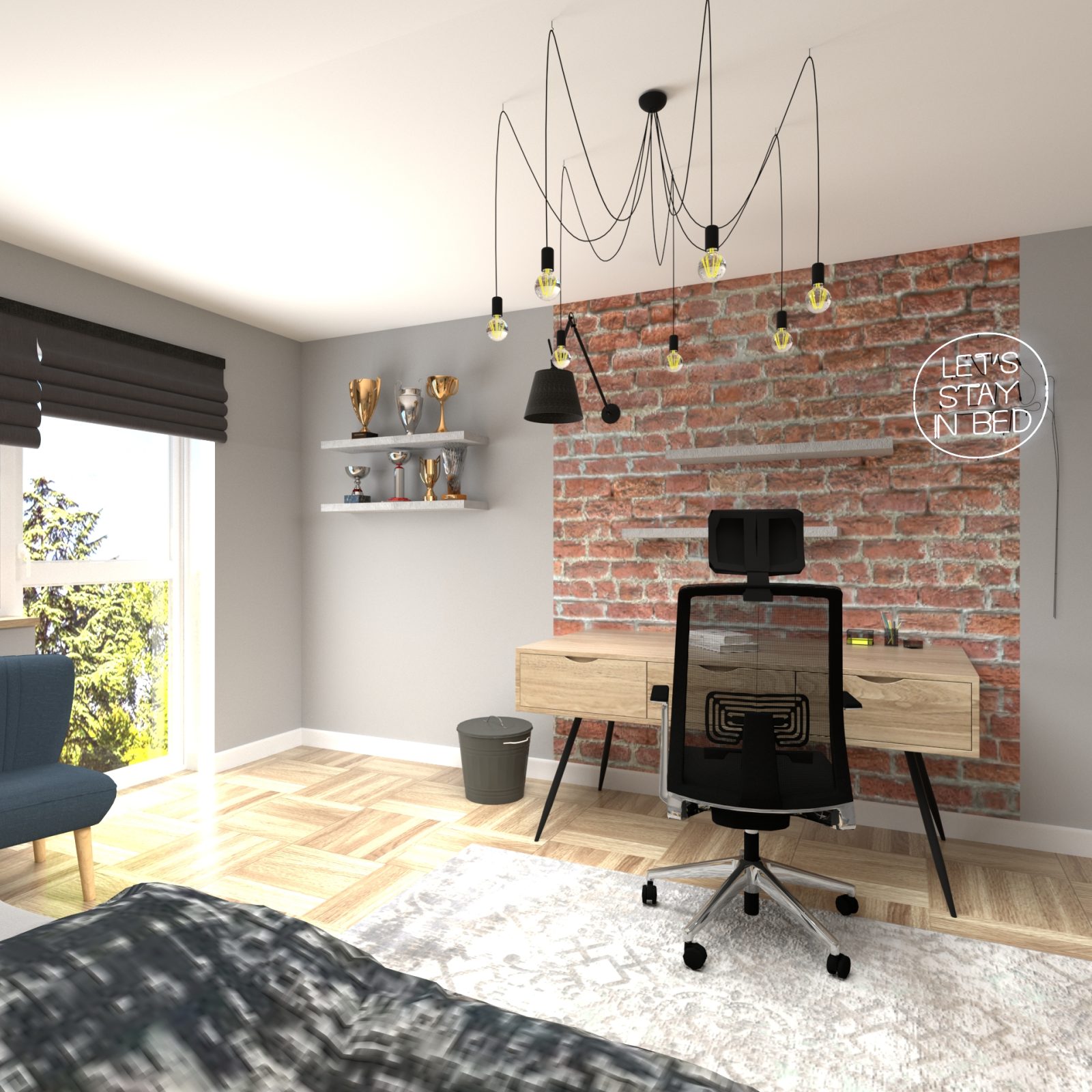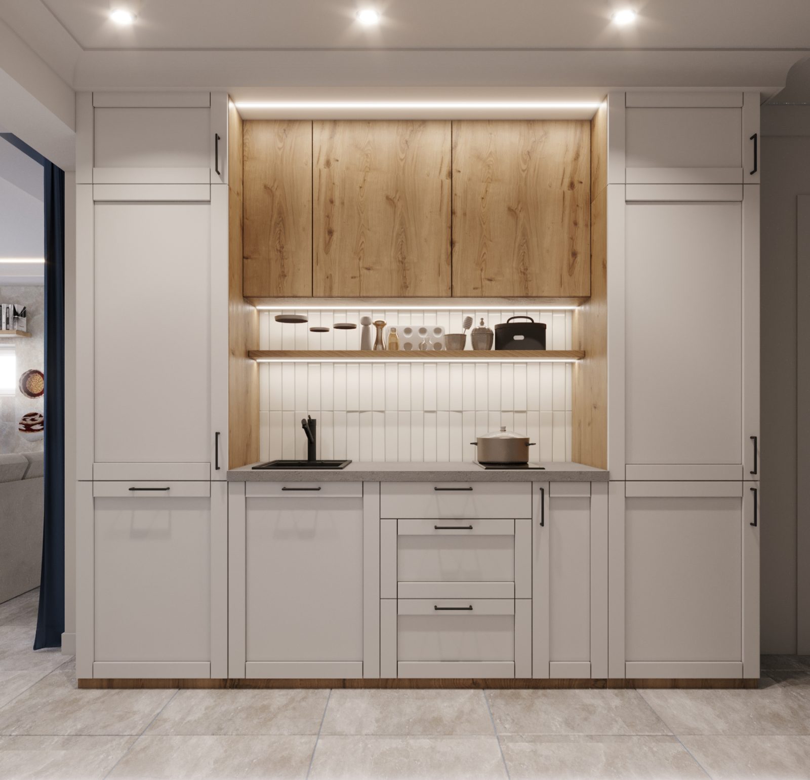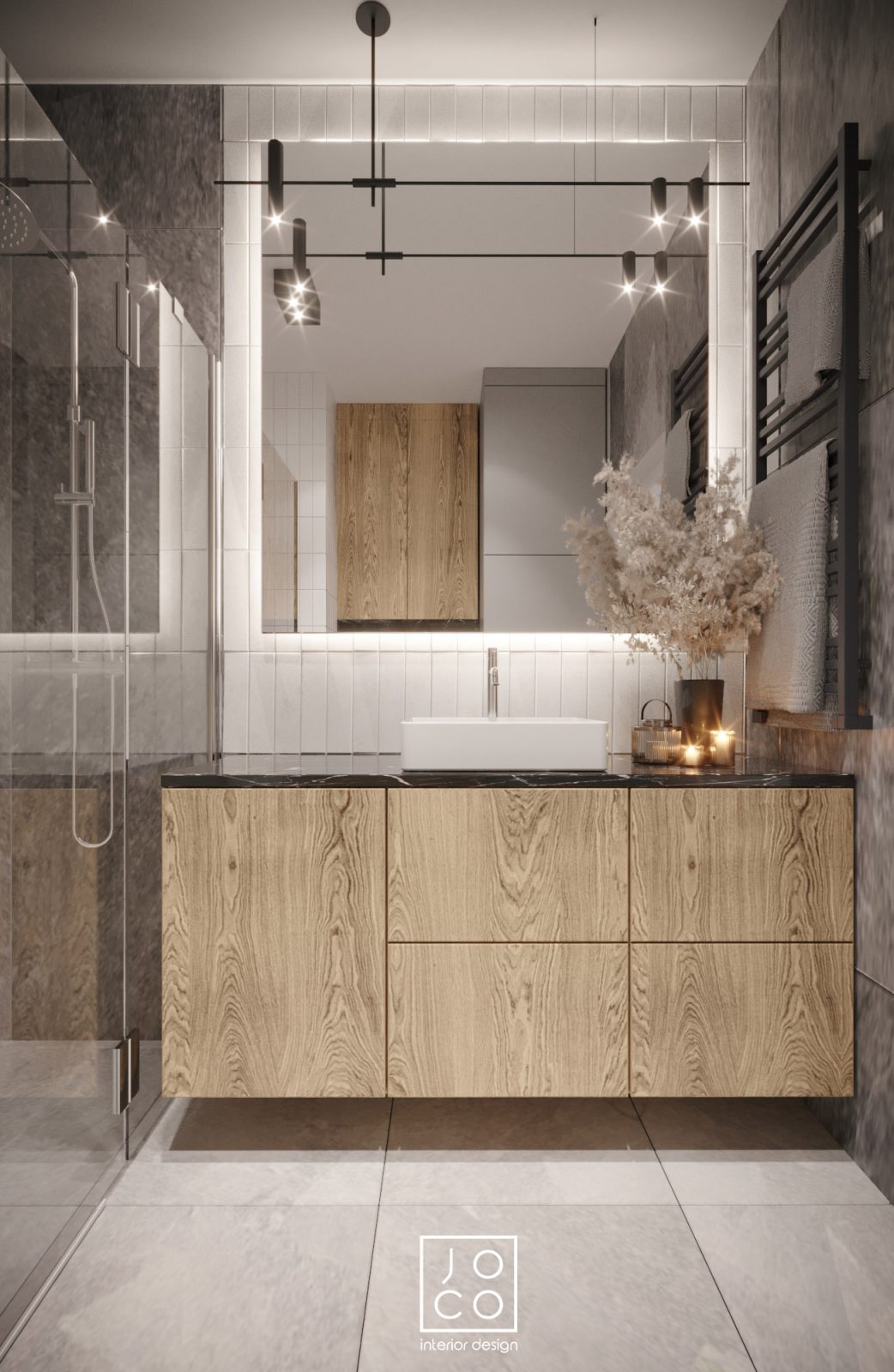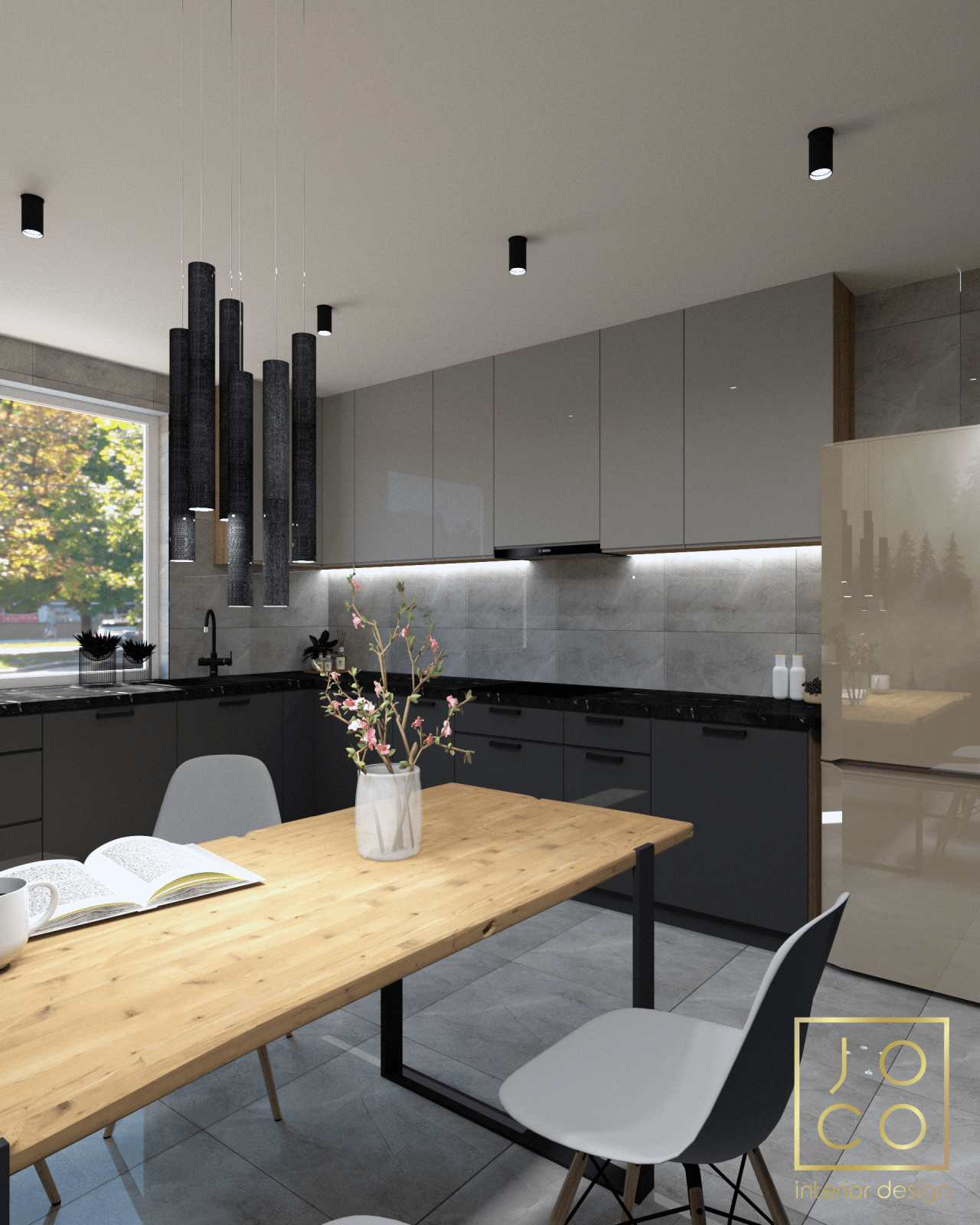 Mieszkanie dla studenta w odcieniach antracytu, beżu i drewna. Nowoczesne ale przytulne, miękkie i plastyczne materiały, zbalansowana kolorystyka. Niebawem – realistyczna sesja.