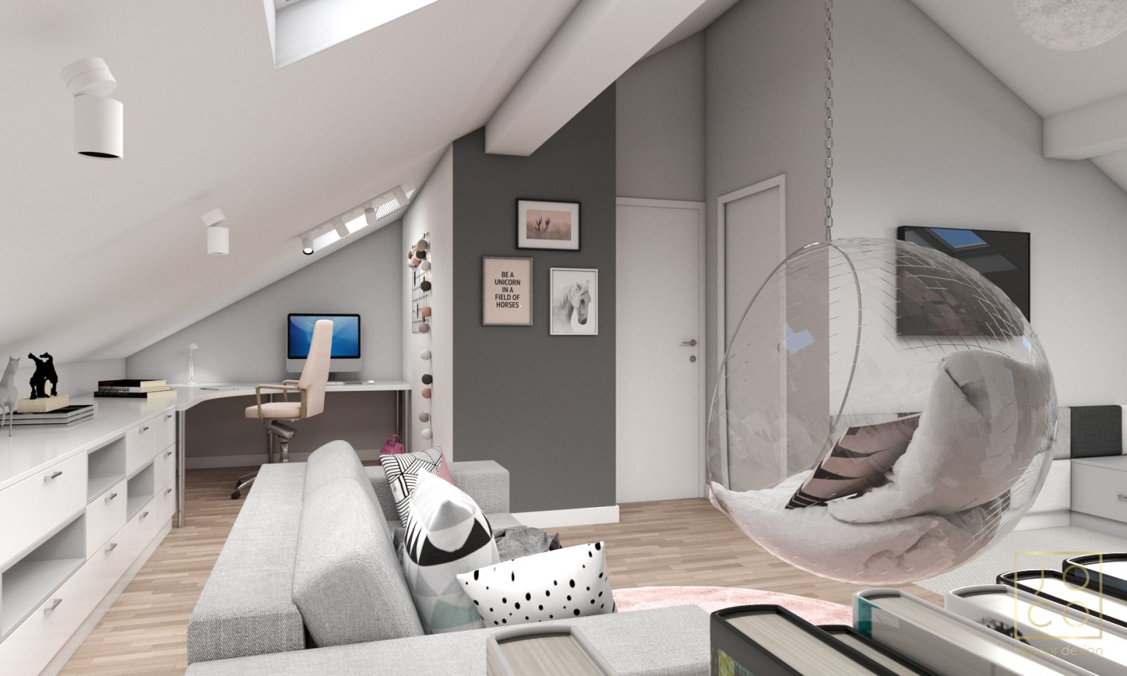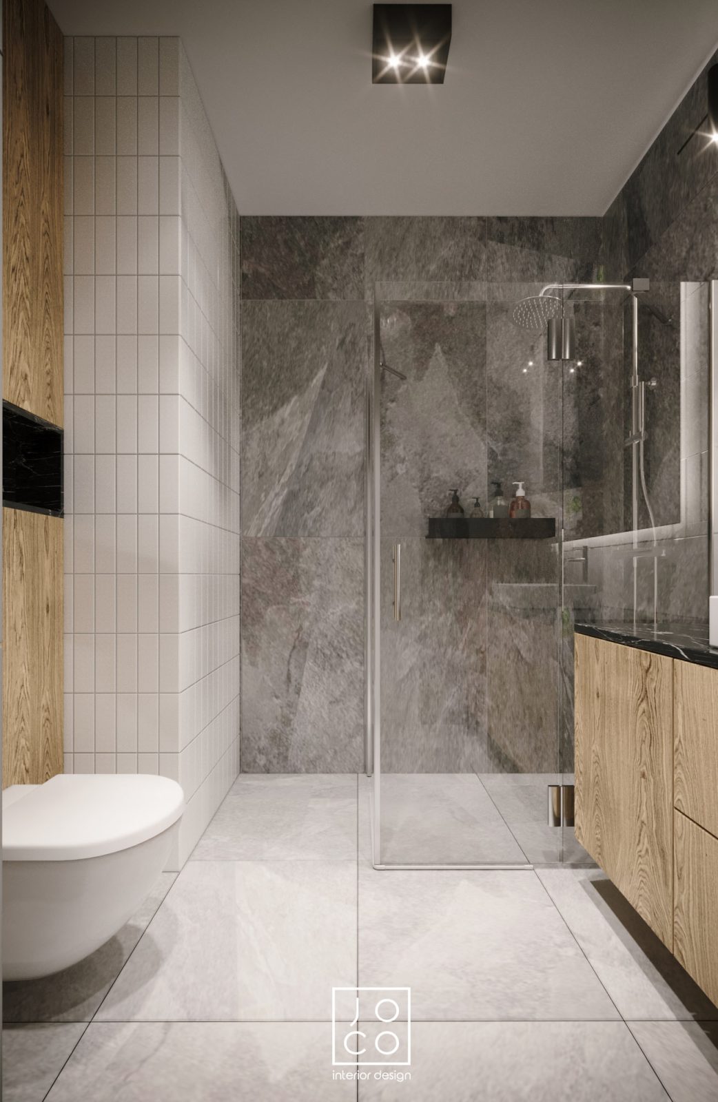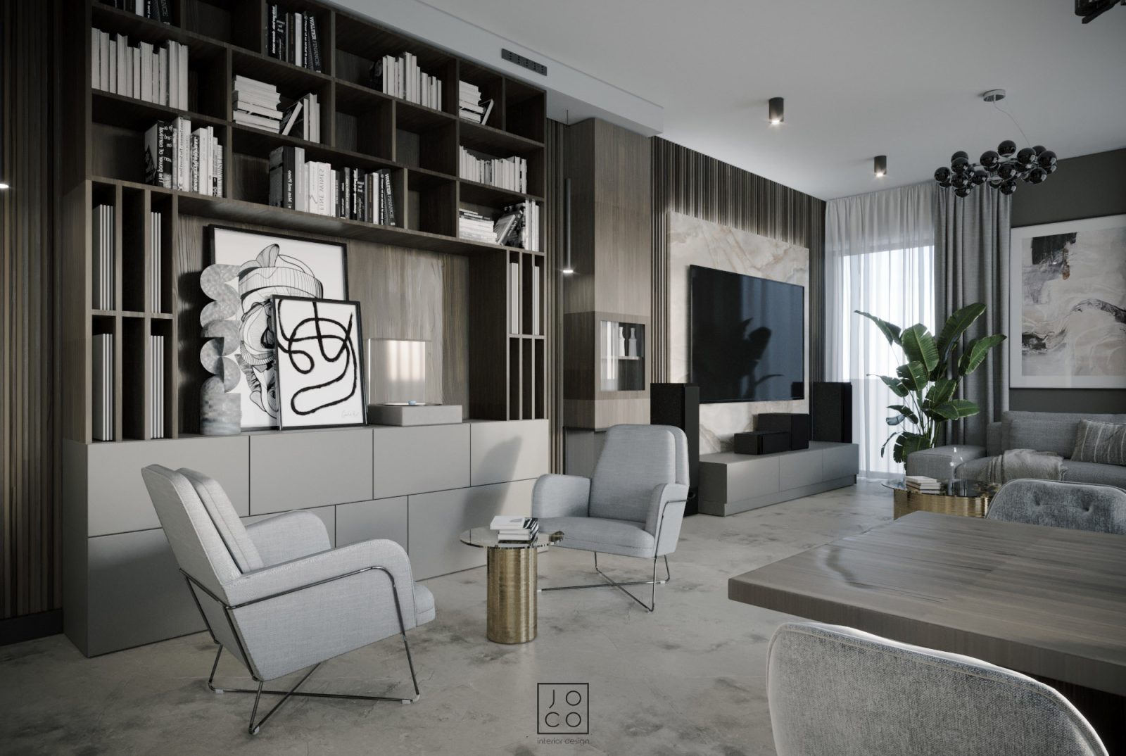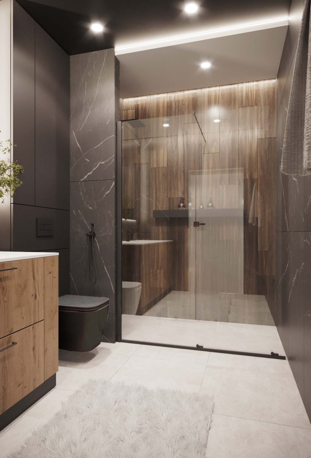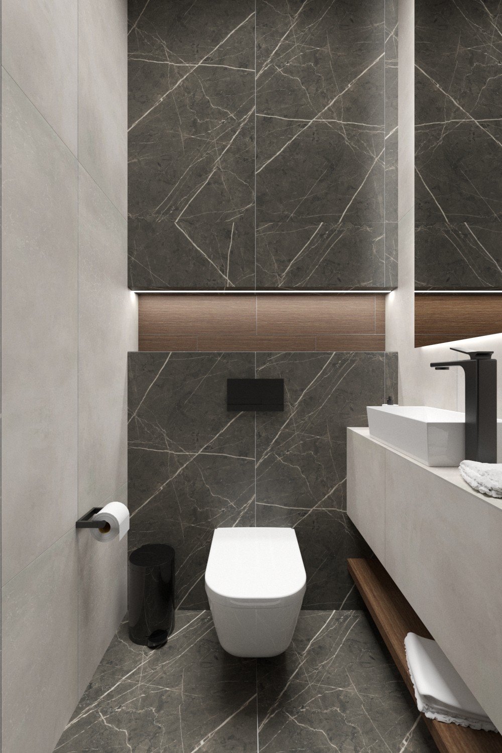 Mieszkanie dla studenta w odcieniach antracytu, beżu i drewna. Nowoczesne ale przytulne, miękkie i plastyczne materiały, zbalansowana kolorystyka. Niebawem – realistyczna sesja.