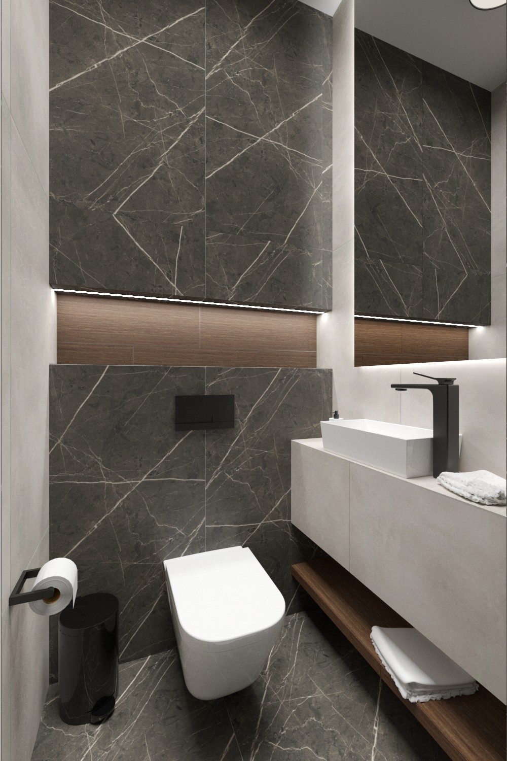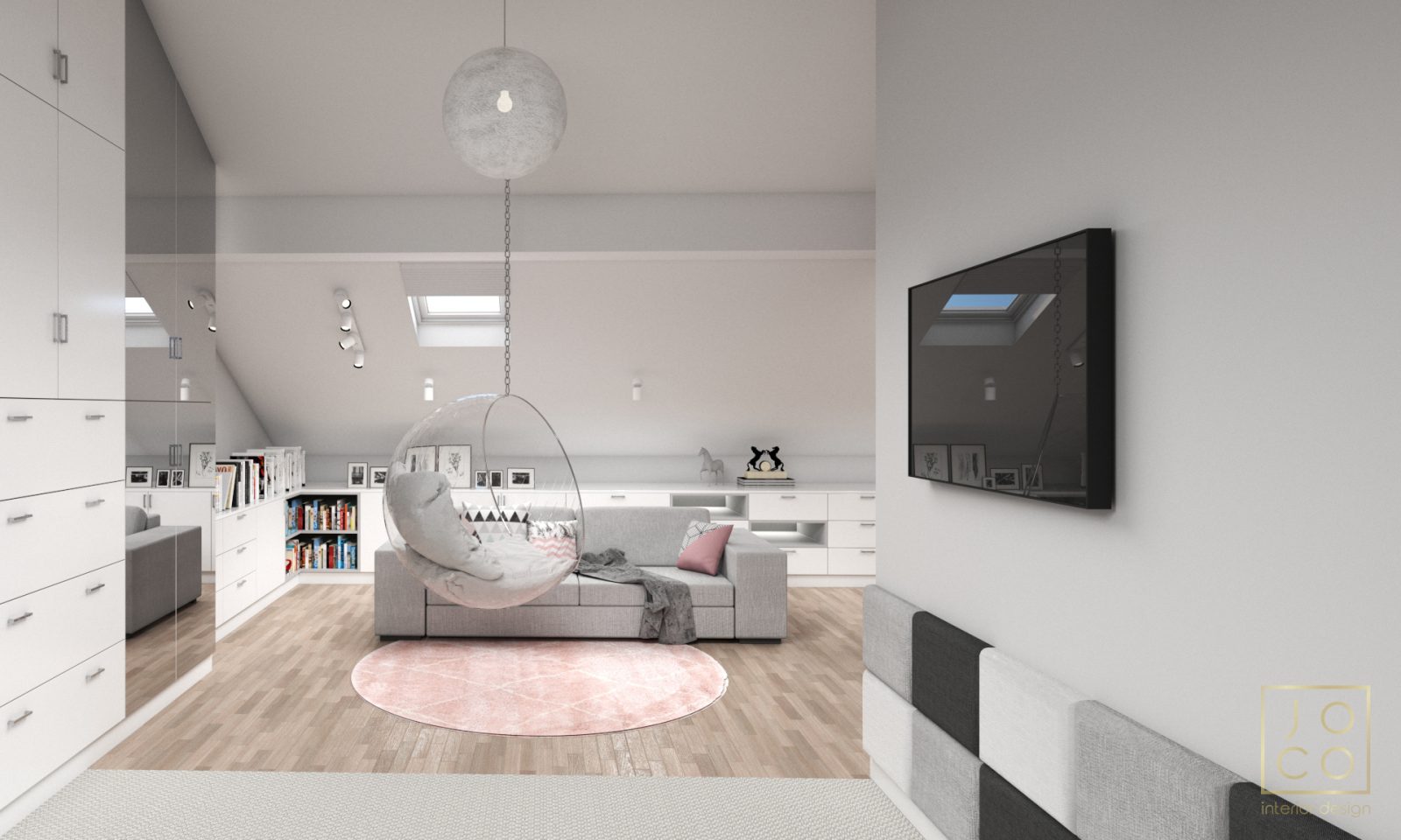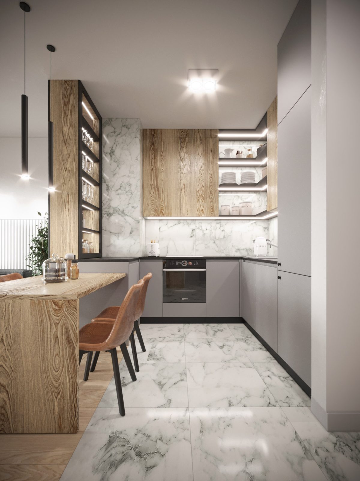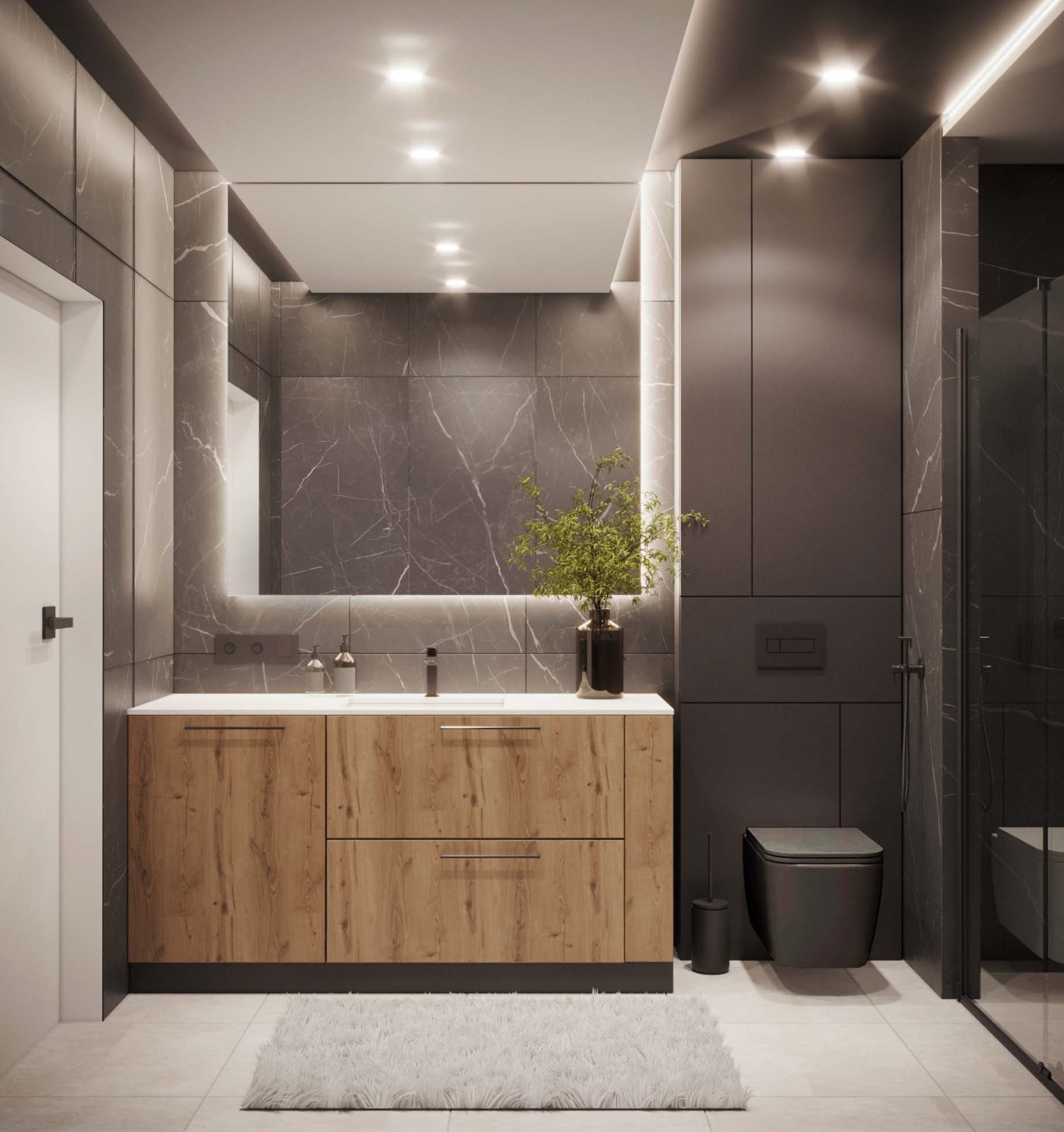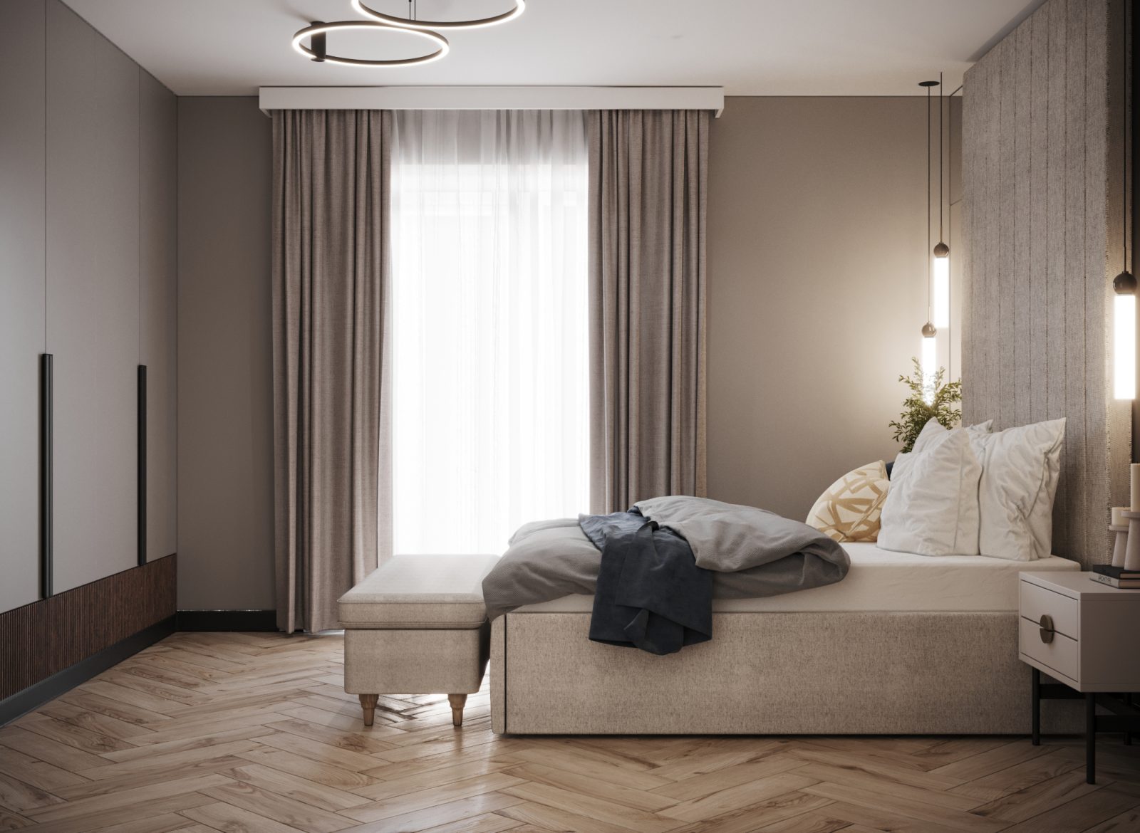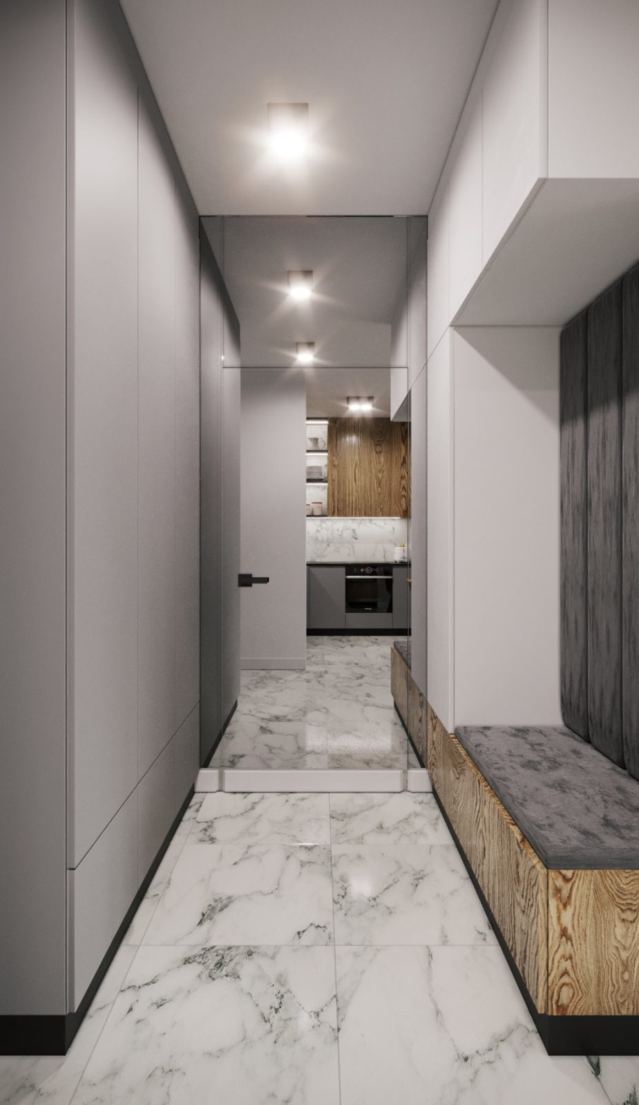 Mieszkanie dla studenta w odcieniach antracytu, beżu i drewna. Nowoczesne ale przytulne, miękkie i plastyczne materiały, zbalansowana kolorystyka. Niebawem – realistyczna sesja.