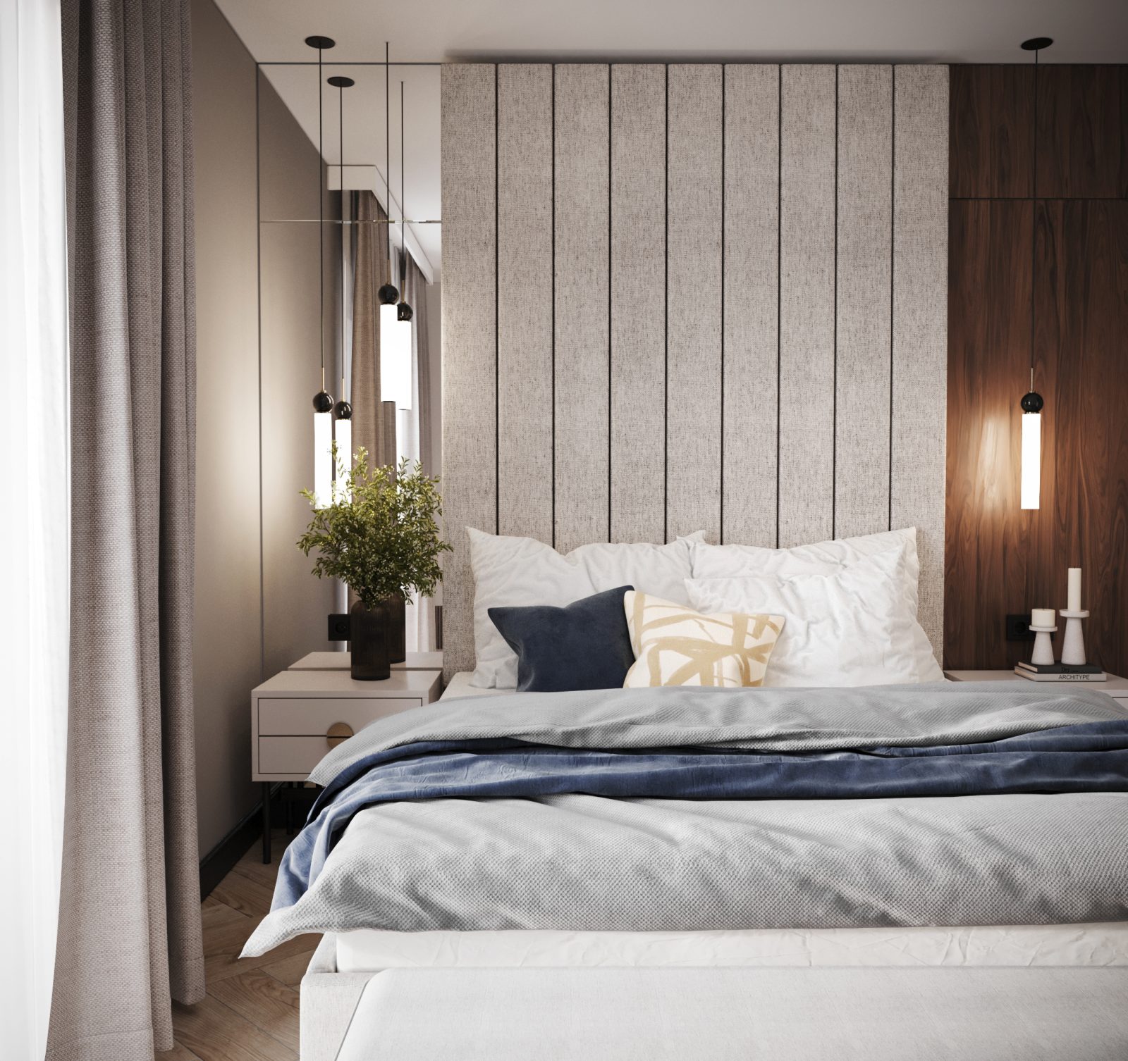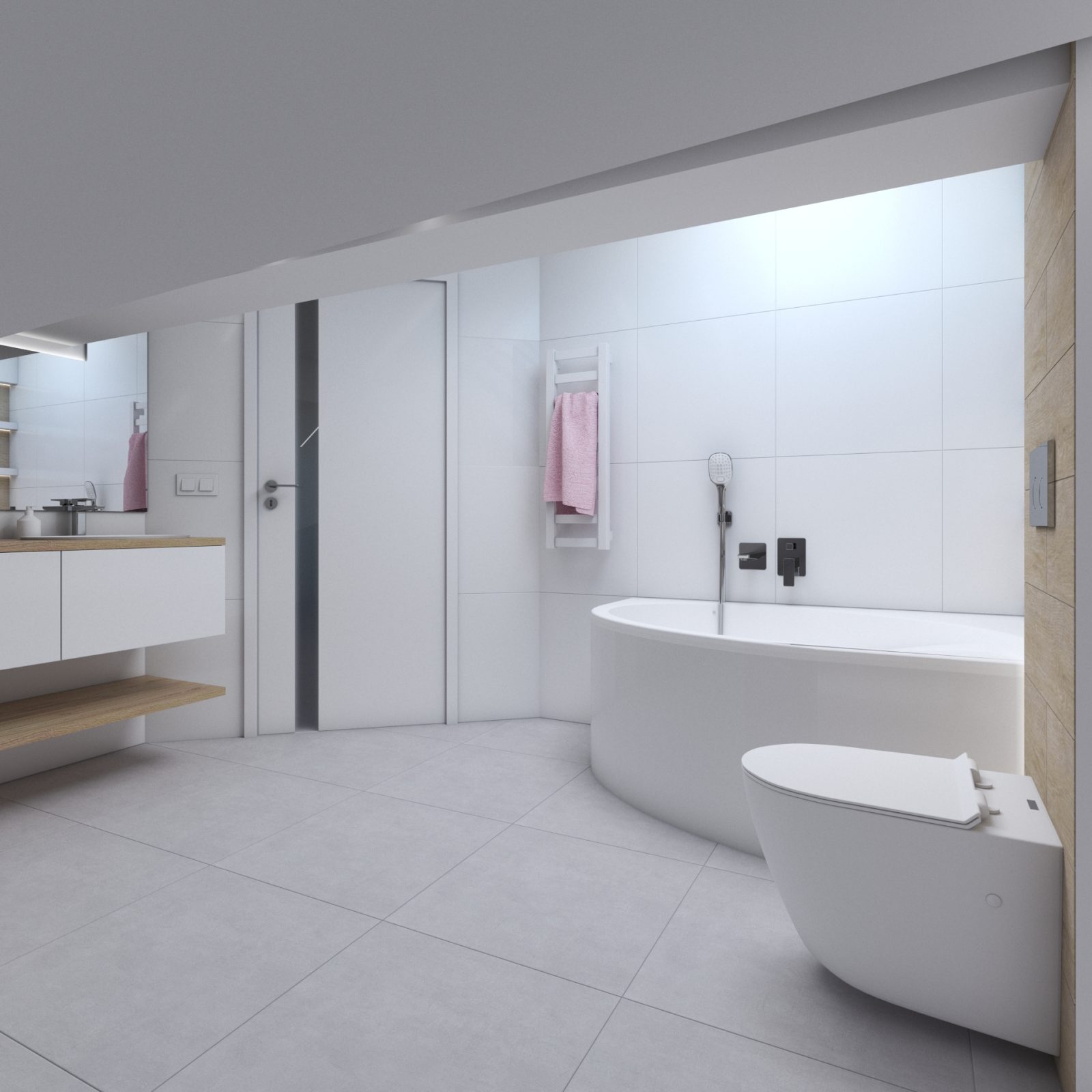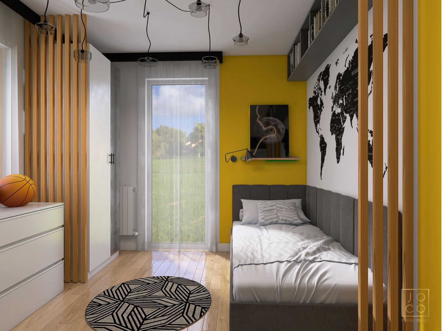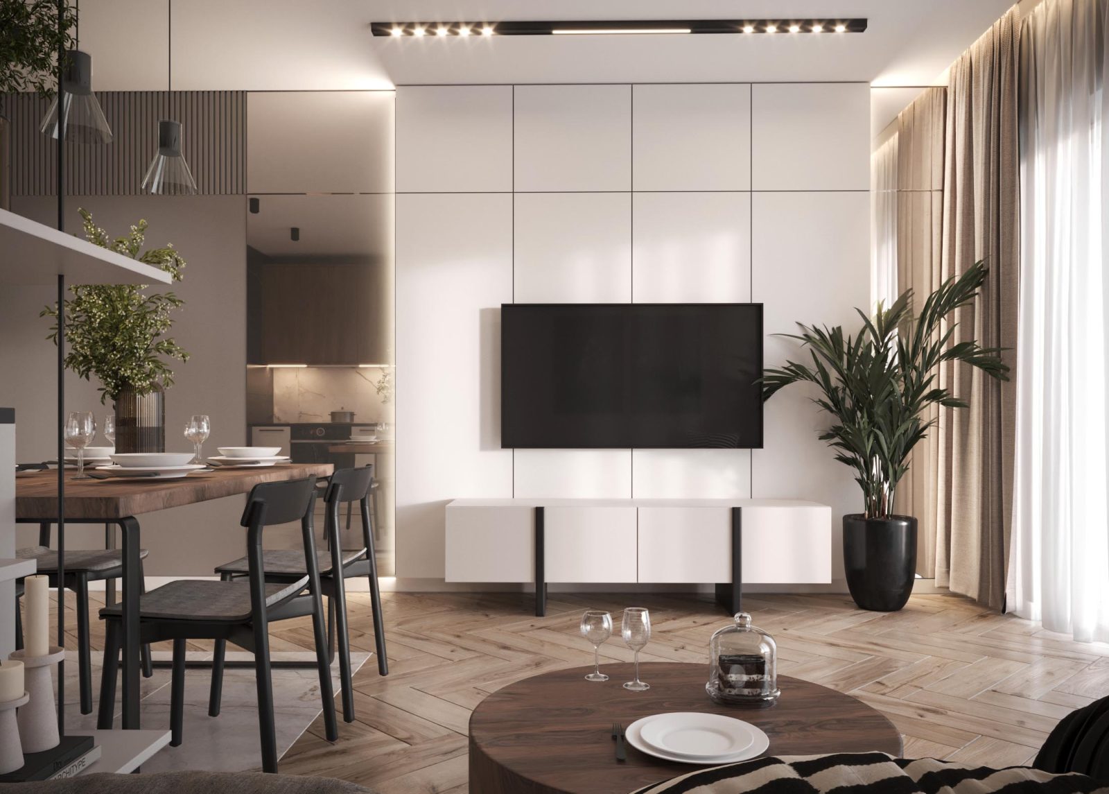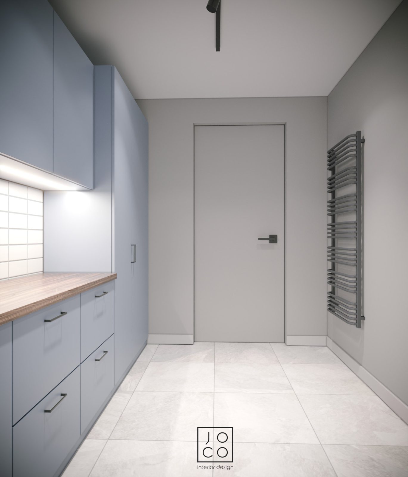Mieszkanie dla studenta w odcieniach antracytu, beżu i drewna. Nowoczesne ale przytulne, miękkie i plastyczne materiały, zbalansowana kolorystyka. Niebawem – realistyczna sesja.