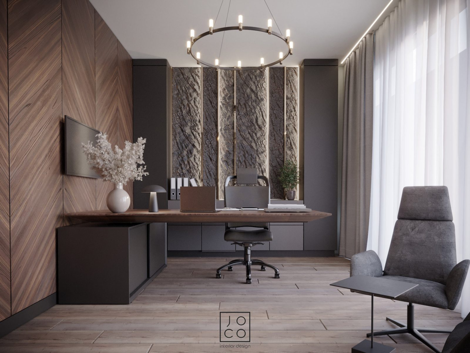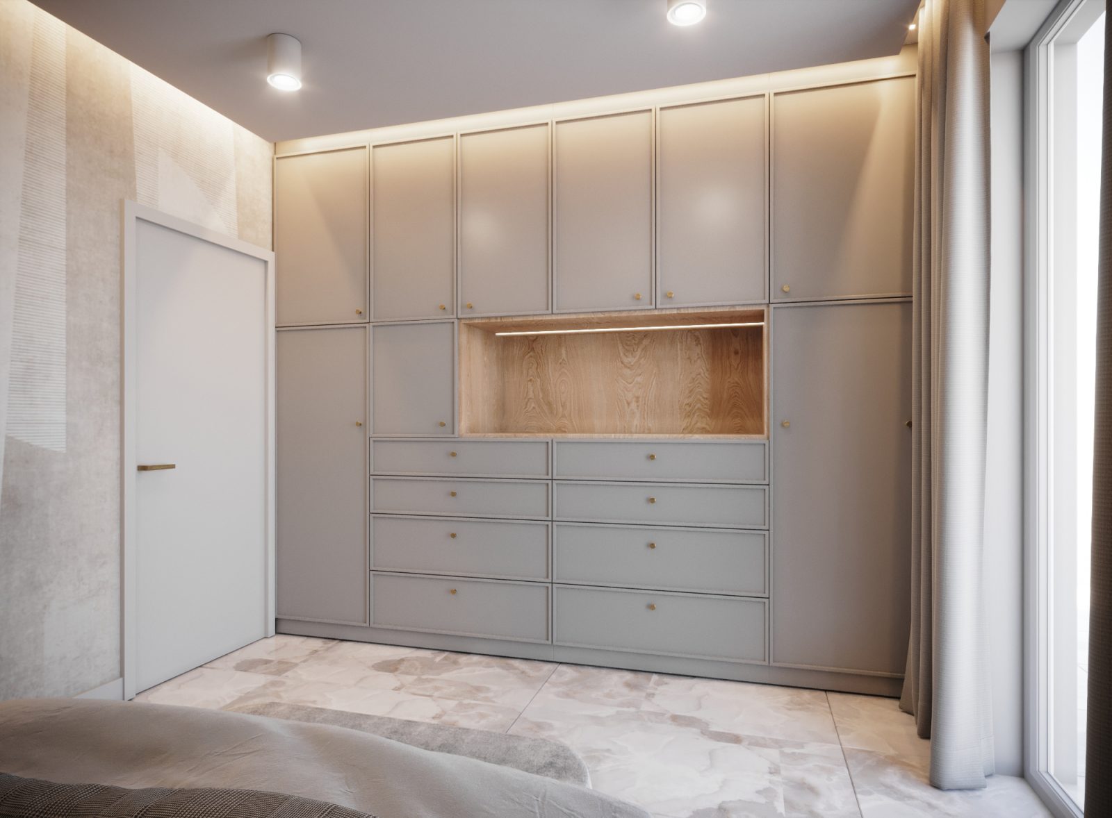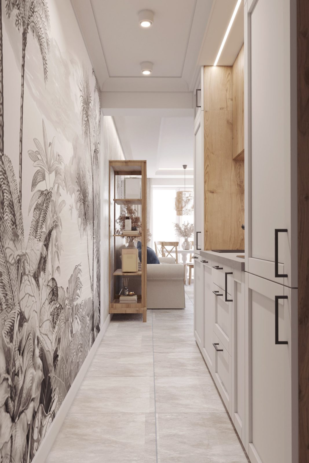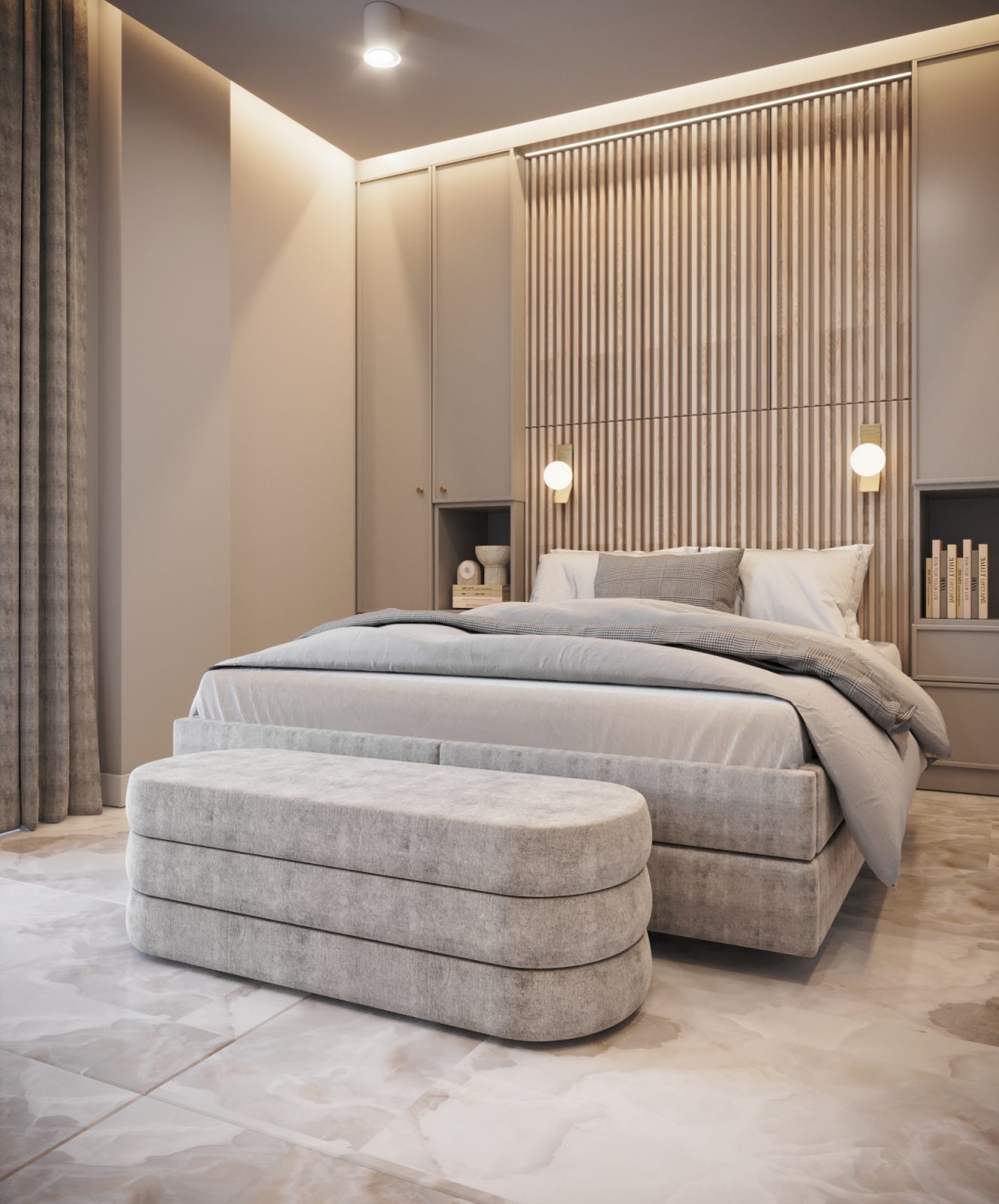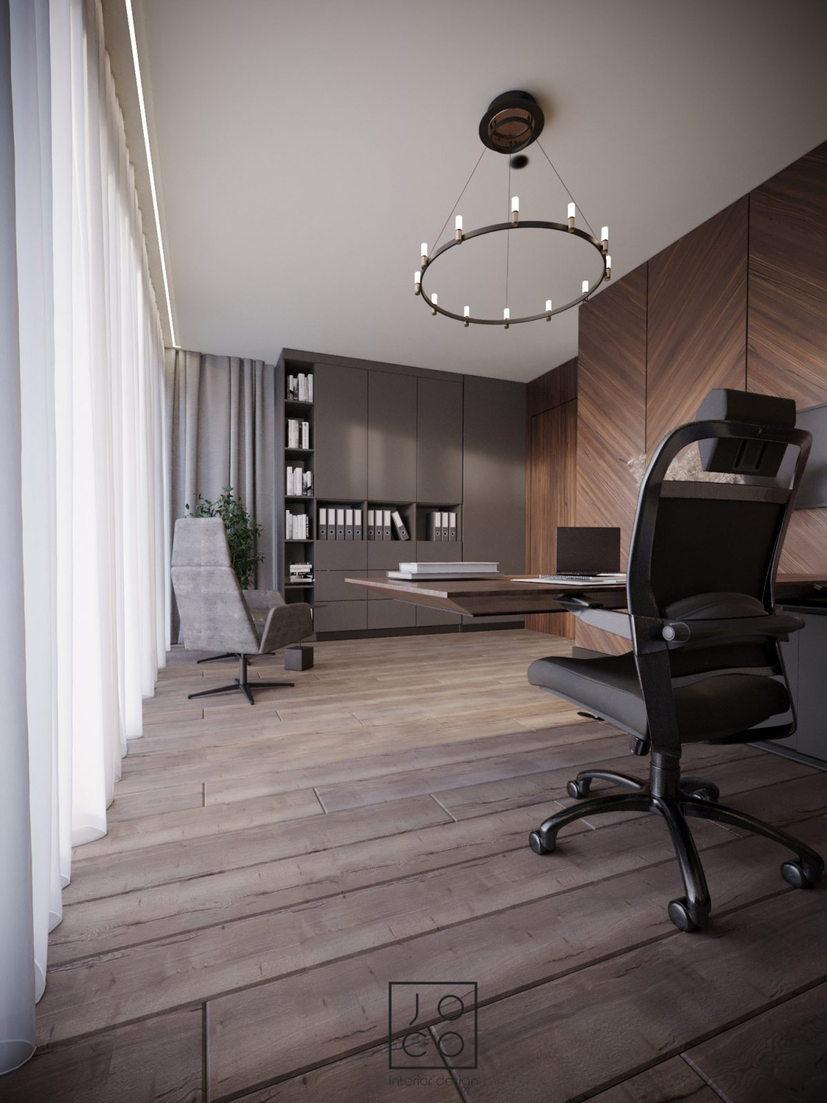 Mieszkanie dla studenta w odcieniach antracytu, beżu i drewna. Nowoczesne ale przytulne, miękkie i plastyczne materiały, zbalansowana kolorystyka. Niebawem – realistyczna sesja.