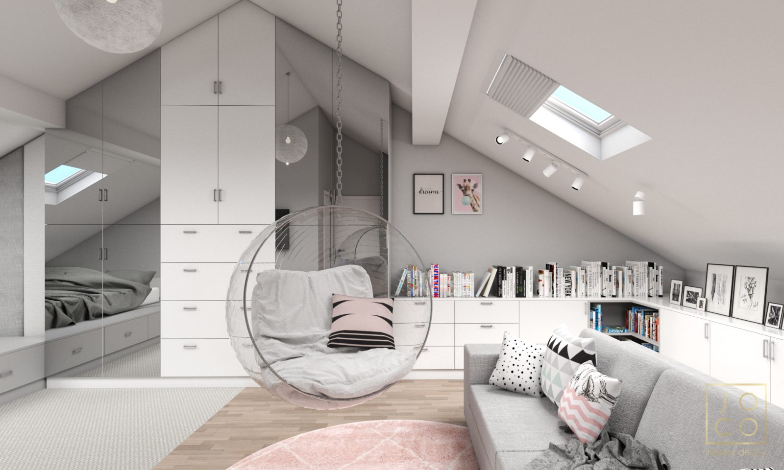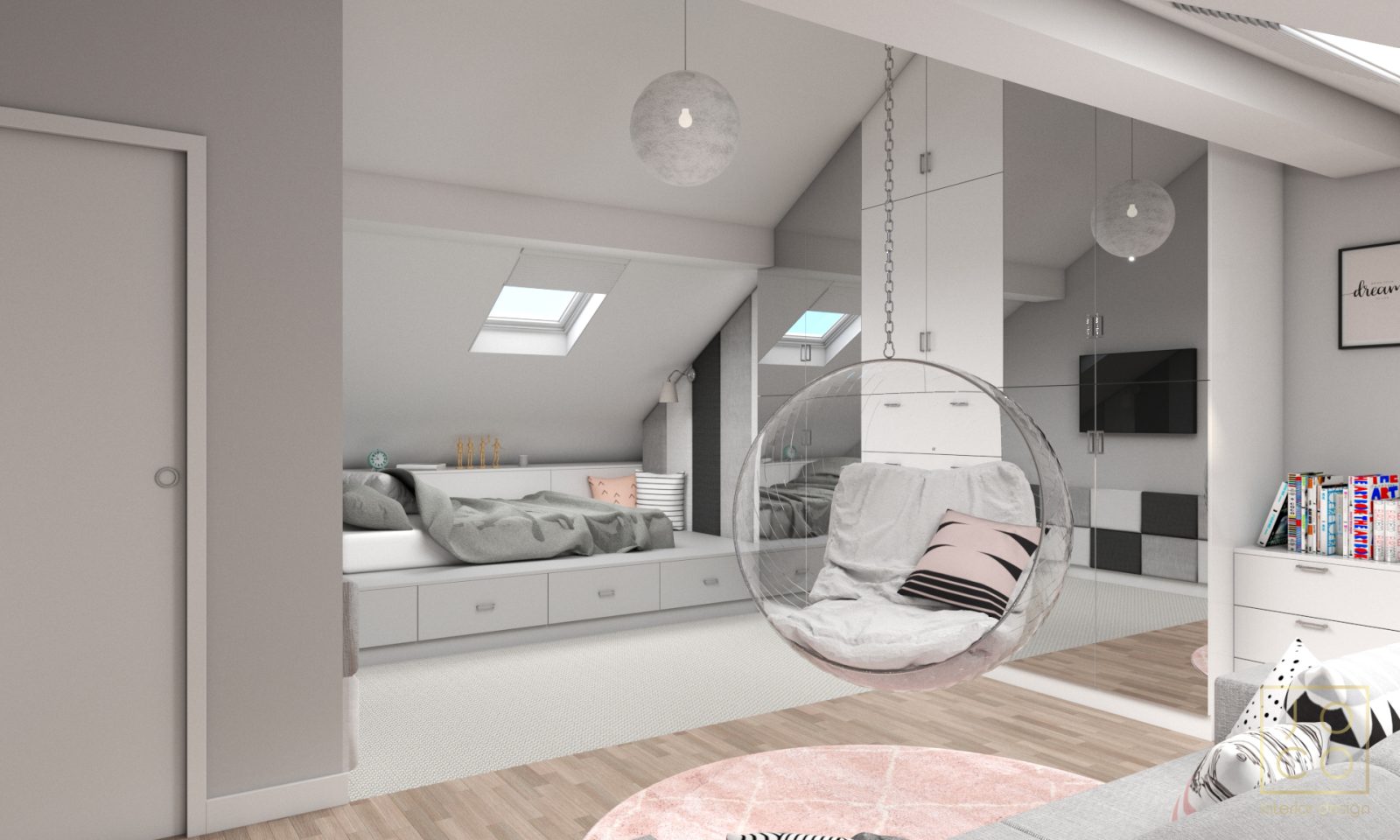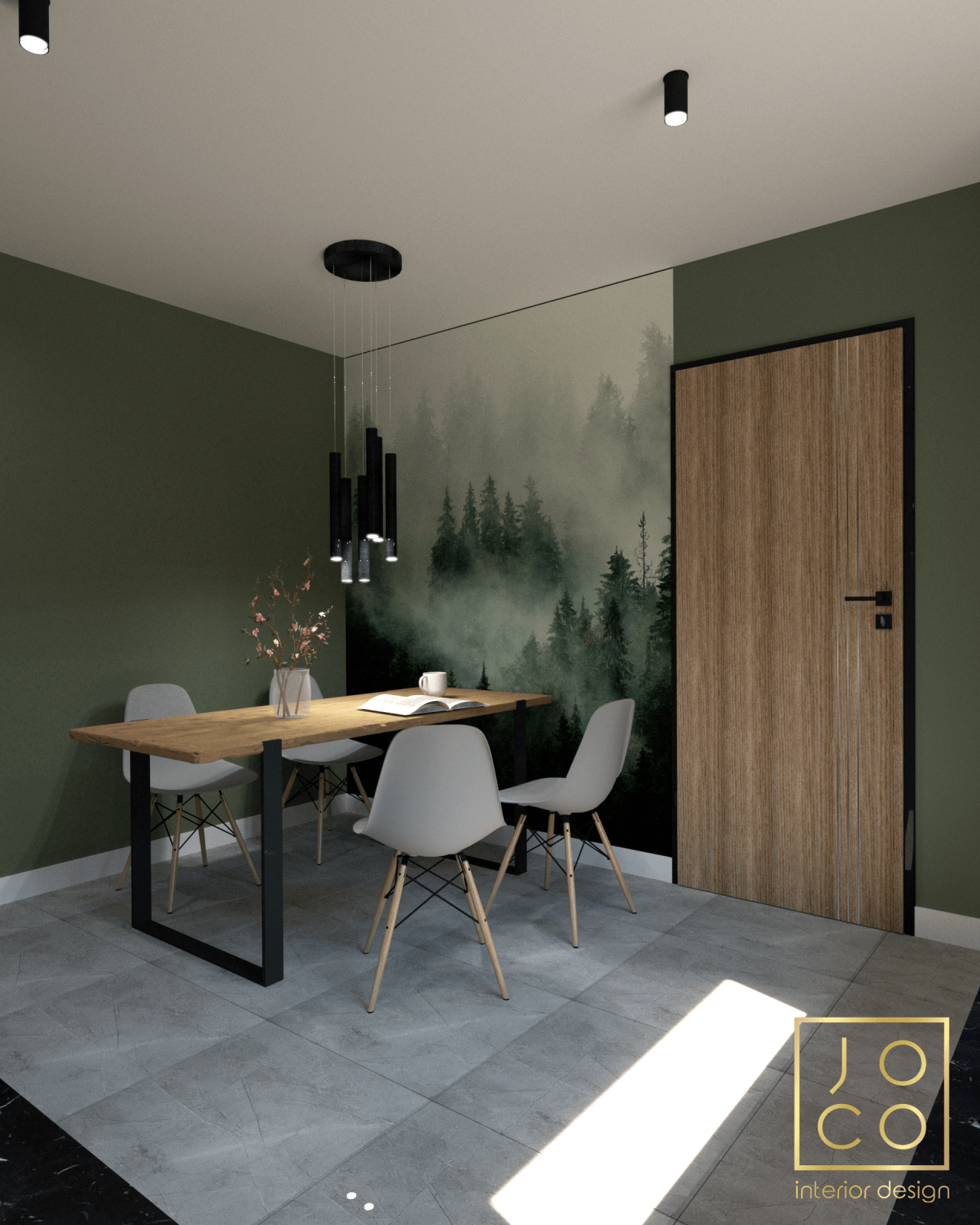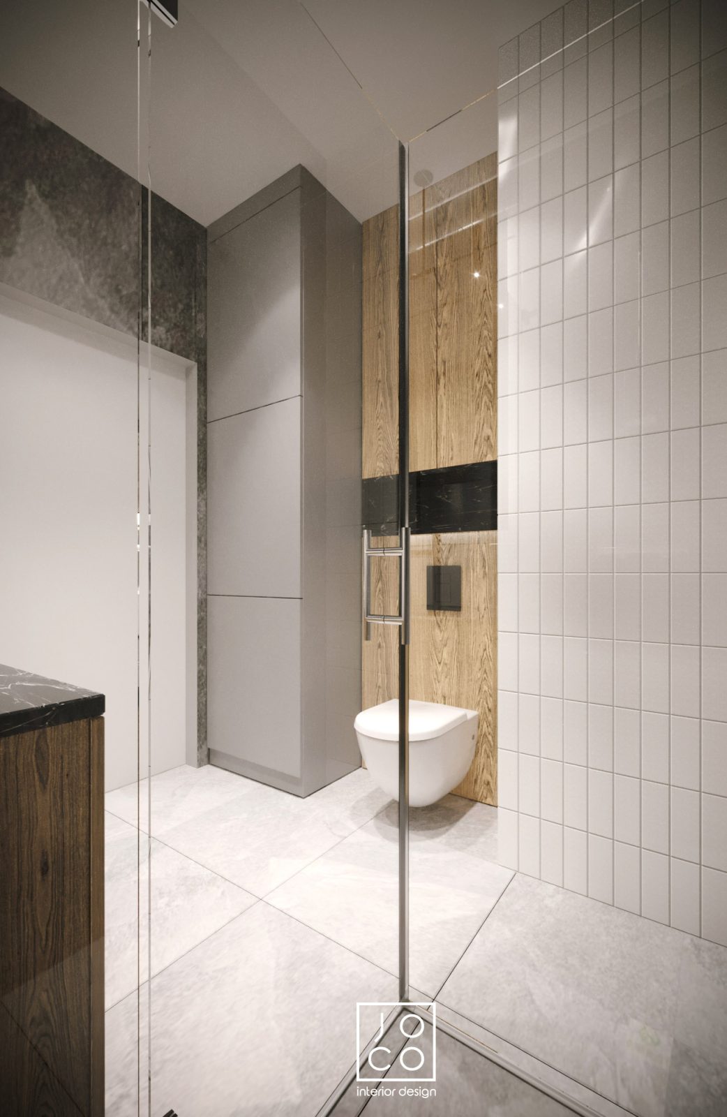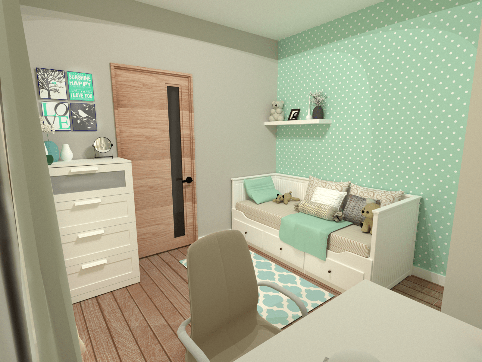 Mieszkanie dla studenta w odcieniach antracytu, beżu i drewna. Nowoczesne ale przytulne, miękkie i plastyczne materiały, zbalansowana kolorystyka. Niebawem – realistyczna sesja.