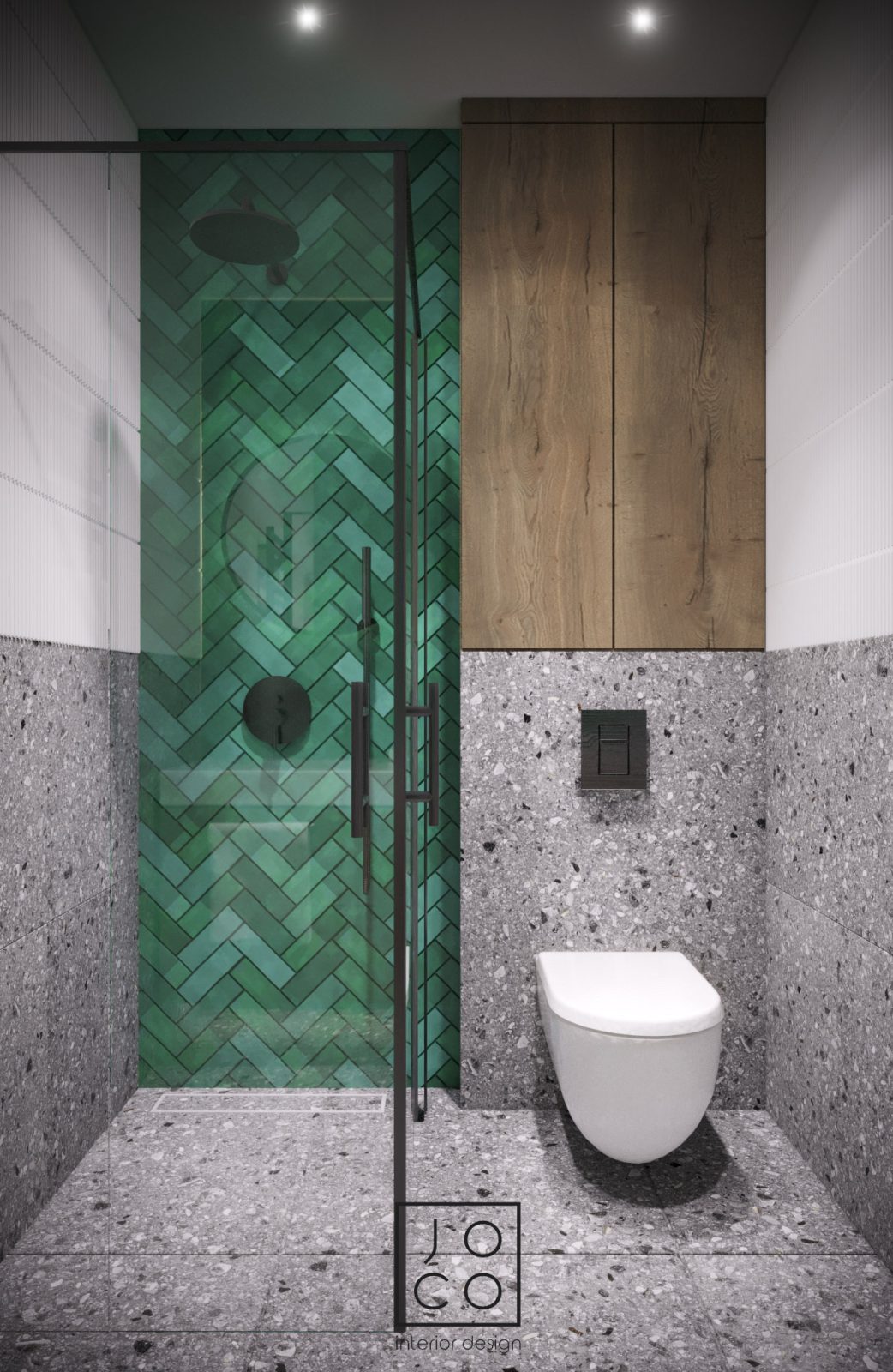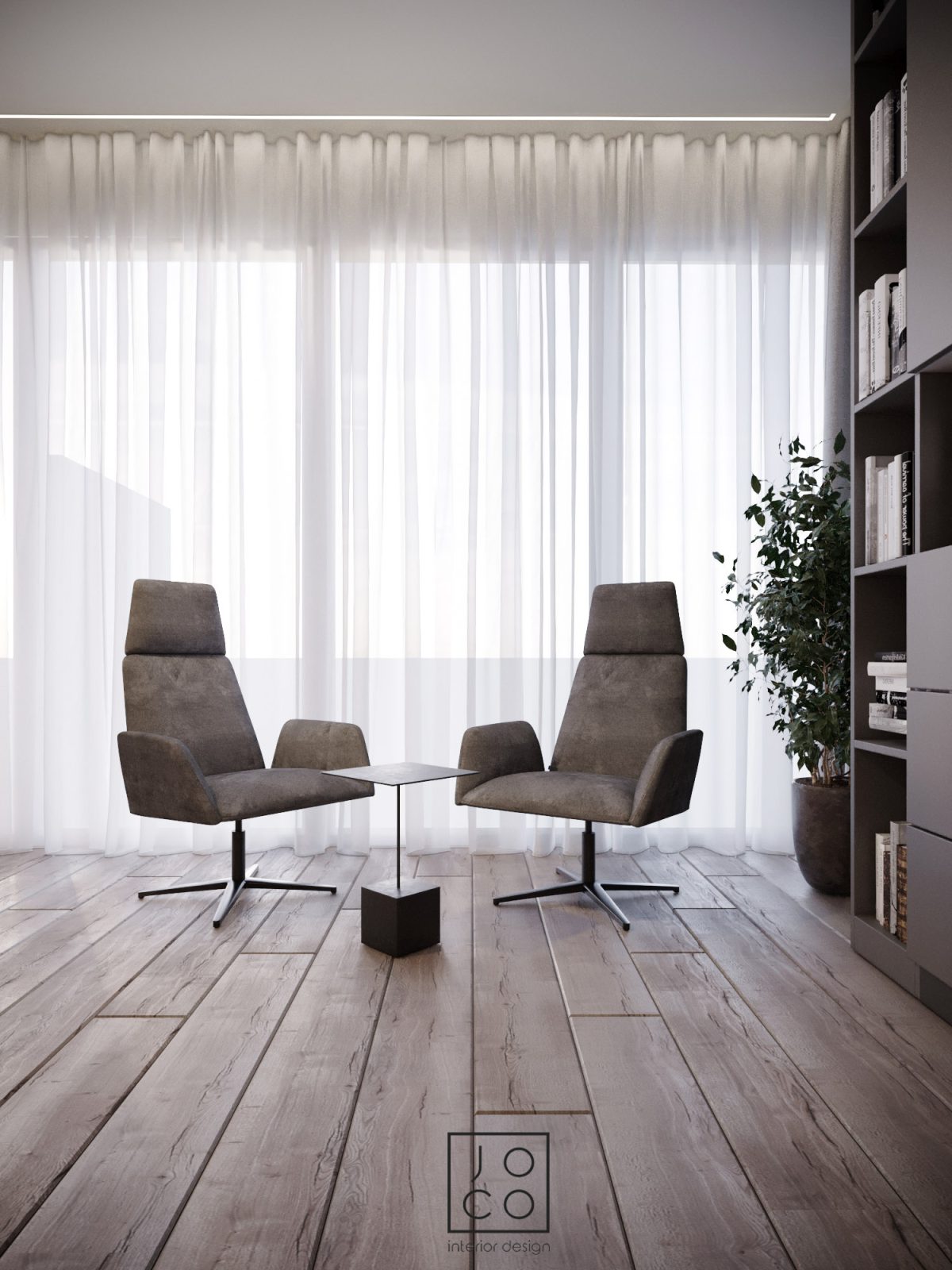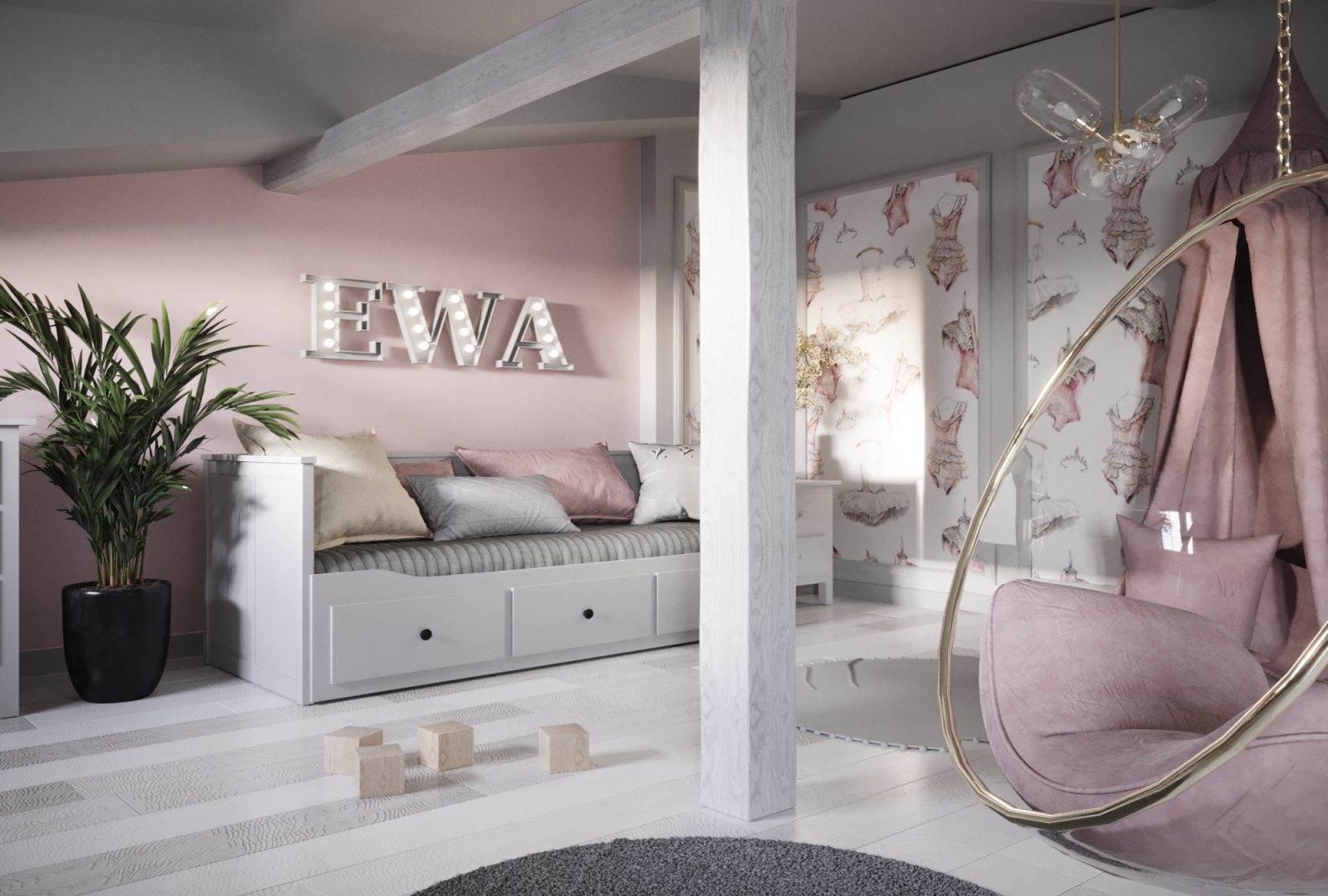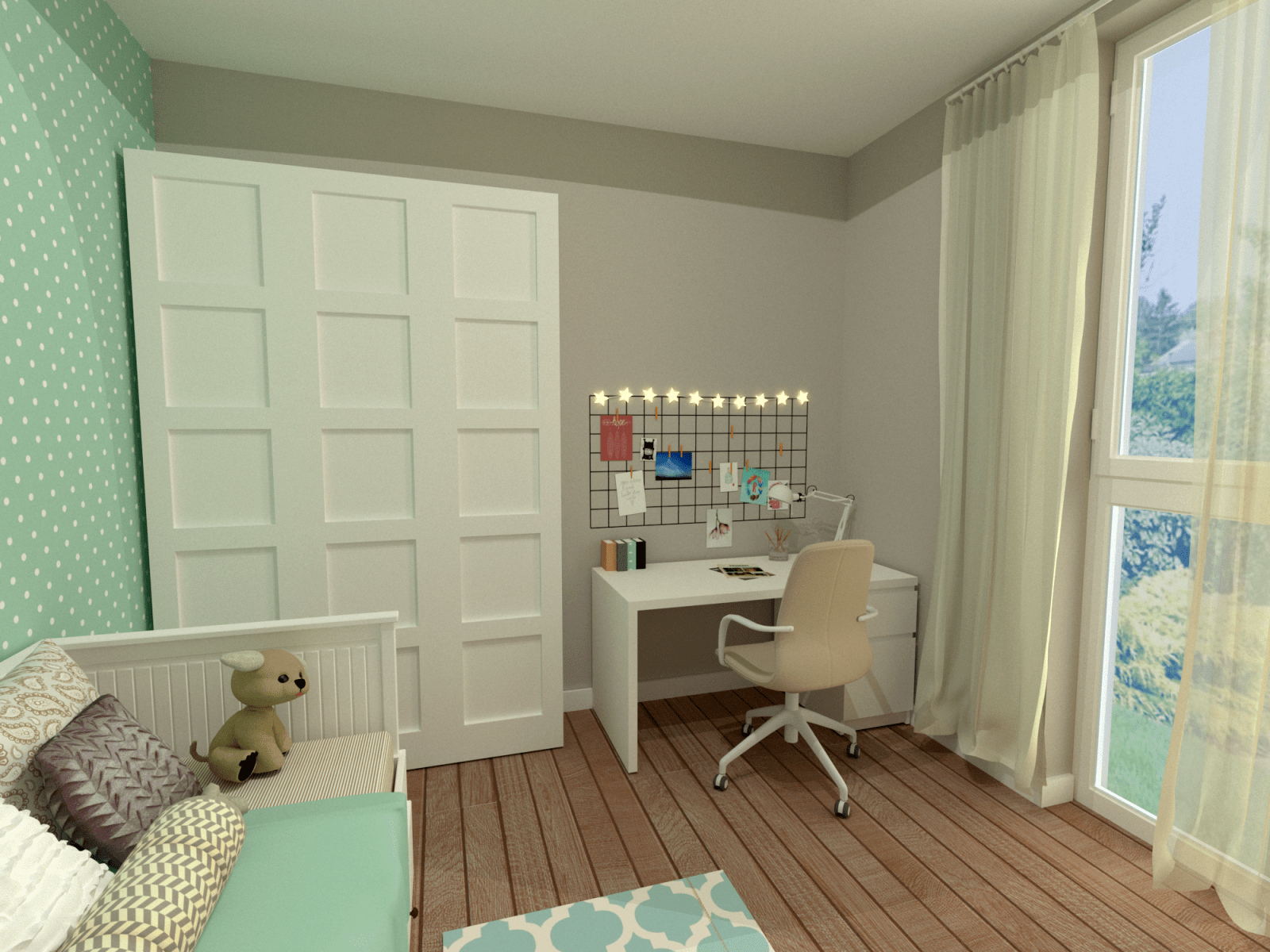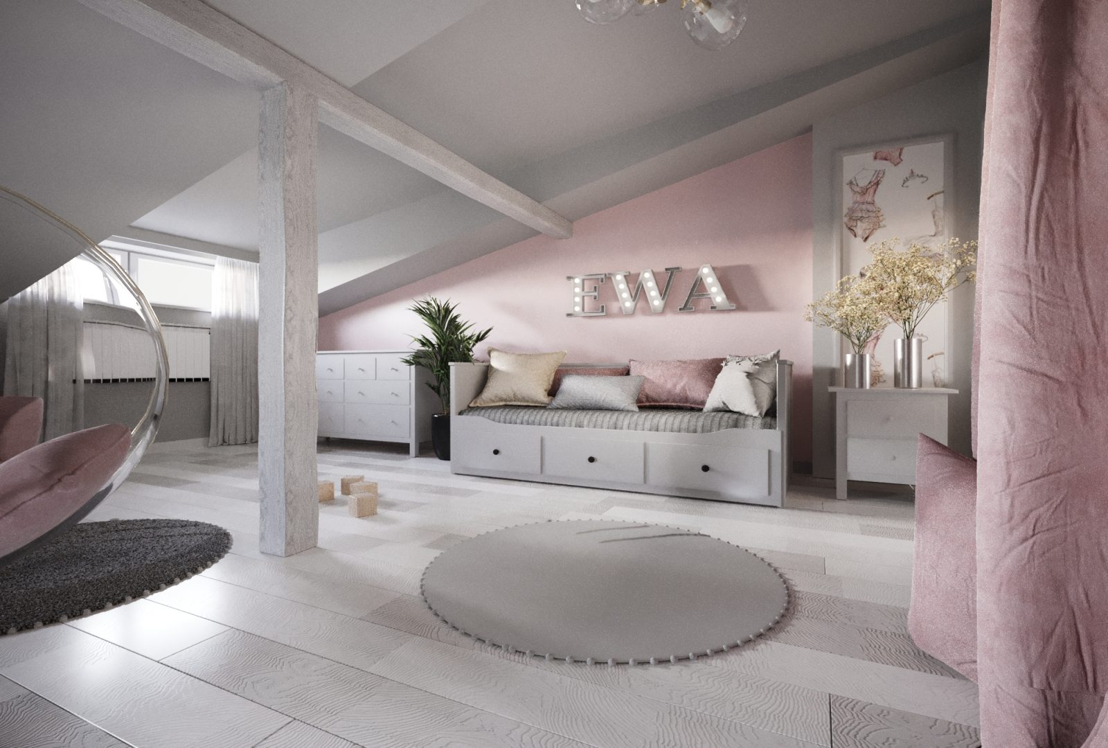 Mieszkanie dla studenta w odcieniach antracytu, beżu i drewna. Nowoczesne ale przytulne, miękkie i plastyczne materiały, zbalansowana kolorystyka. Niebawem – realistyczna sesja.